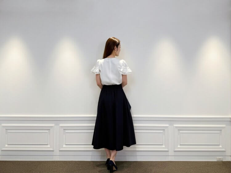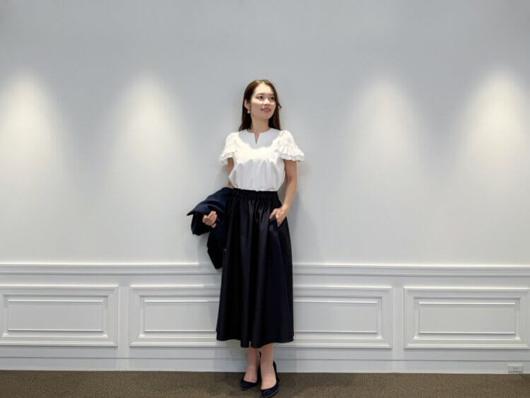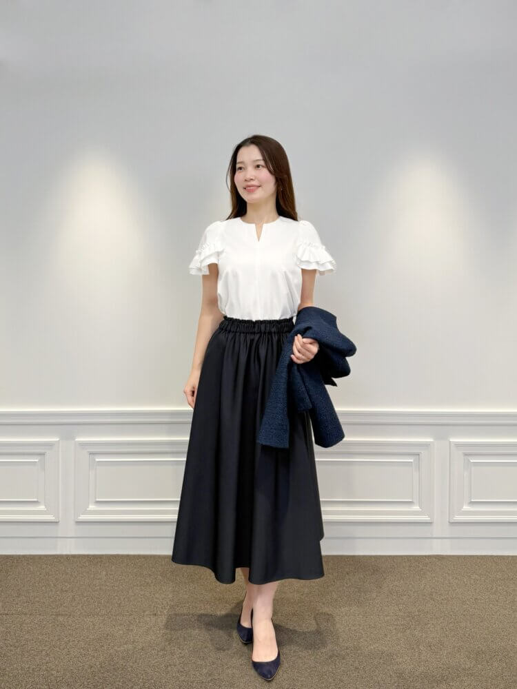 ホワイトの華やぎあるトップスに、ネイビーのジャケットとスカートを合わせることで、甘さを知性で整えた端正な装いに仕上げました。立体的なフリルが視線を上に導き、全体を軽やかな印象に導きます。足元にはネイビーのパンプスを合わせ、統一感のあるエレガントなバランスに。きちんと感と女性らしさを兼ね備えた、完成度の高いスタイルです。