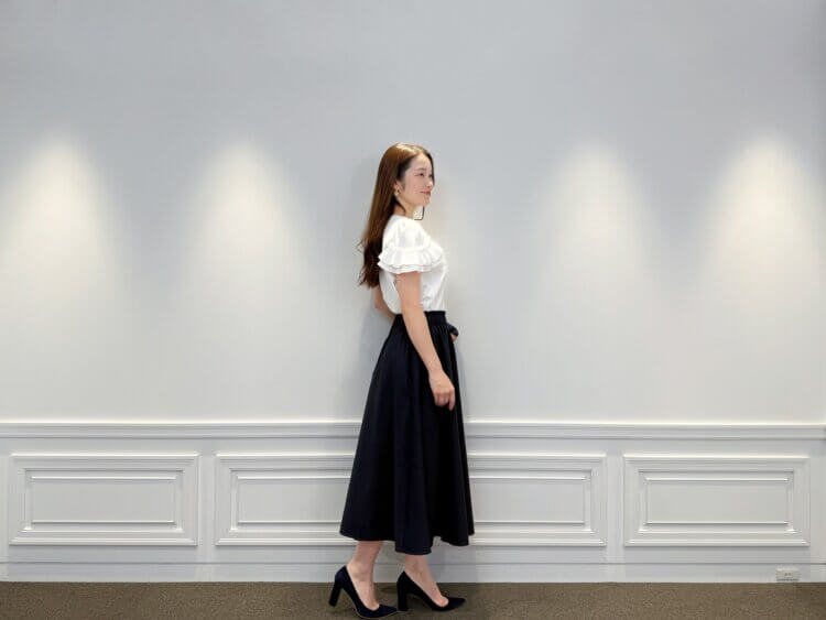 今回はフリルブラウスを主役にした、品格漂うネイビースタイルのコーディネートをご紹介します!