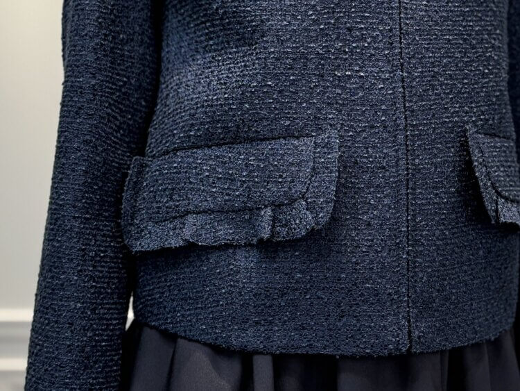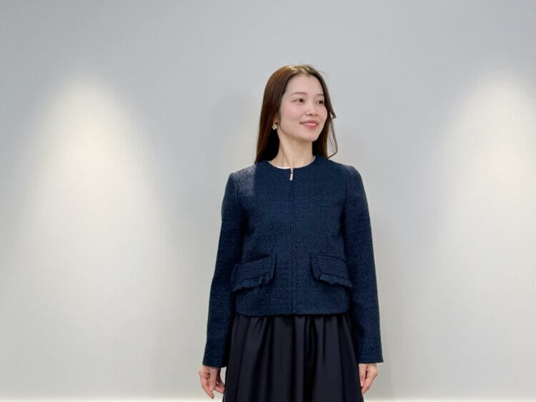<ジップアップツイードジャケット>は、ネイビーカラーが持つ落ち着きと上質感が魅力の一着。すっきりとしたジップアップ仕様が端正な印象を与え、フリルブラウスの華やぎを引き立てながら全体をきちんと整えます。コンパクトなシルエットでバランスが取りやすく、通勤や改まった席にもふさわしい佇まいを演出します。