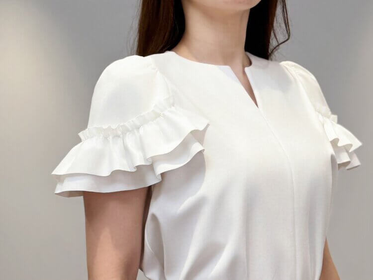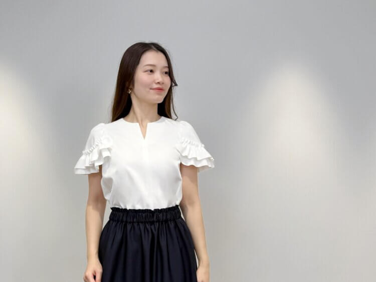 <フリルスリーブキーネックフレアブラウス>は、フレンチスリーブの袖口にあしらわれた立体的なフリルが印象的な一枚です。すっきりと開いたキーネックが顔まわりをシャープに見せ、甘さのあるディテールと洗練されたバランスを叶えてくれます。素材にはストレッチ性に優れたポンチ素材を使用し、しなやかな着心地と美しいシルエットを両立。UVカット機能と接触冷感機能を備えているため、気温が高くなる季節にも快適に着用でき、ご家庭で手洗いが可能なのも嬉しいポイントです。後ろ身頃をやや長めに設計したフレアシルエットは、動くたびにやさしく揺れ、自然と体のラインをカバーしながら女性らしいニュアンスを添えてくれます。