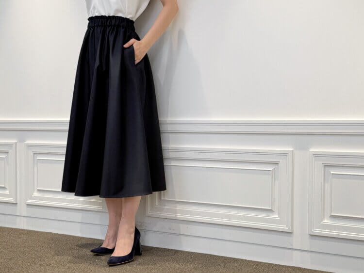 <ウエストゴムギャザーフレアスカート>は、動くたびに優雅に揺れるシルエットが女性らしさを引き立てる一枚です。ネイビーを選ぶことでトップスの白がより際立ち、全体に洗練された印象をもたらします。ウエストゴム仕様でありながら上品さを損なわず、快適な着心地と美しいラインを両立。トップスのフレアと呼応する柔らかな広がりが、統一感のあるスタイルを完成させます。