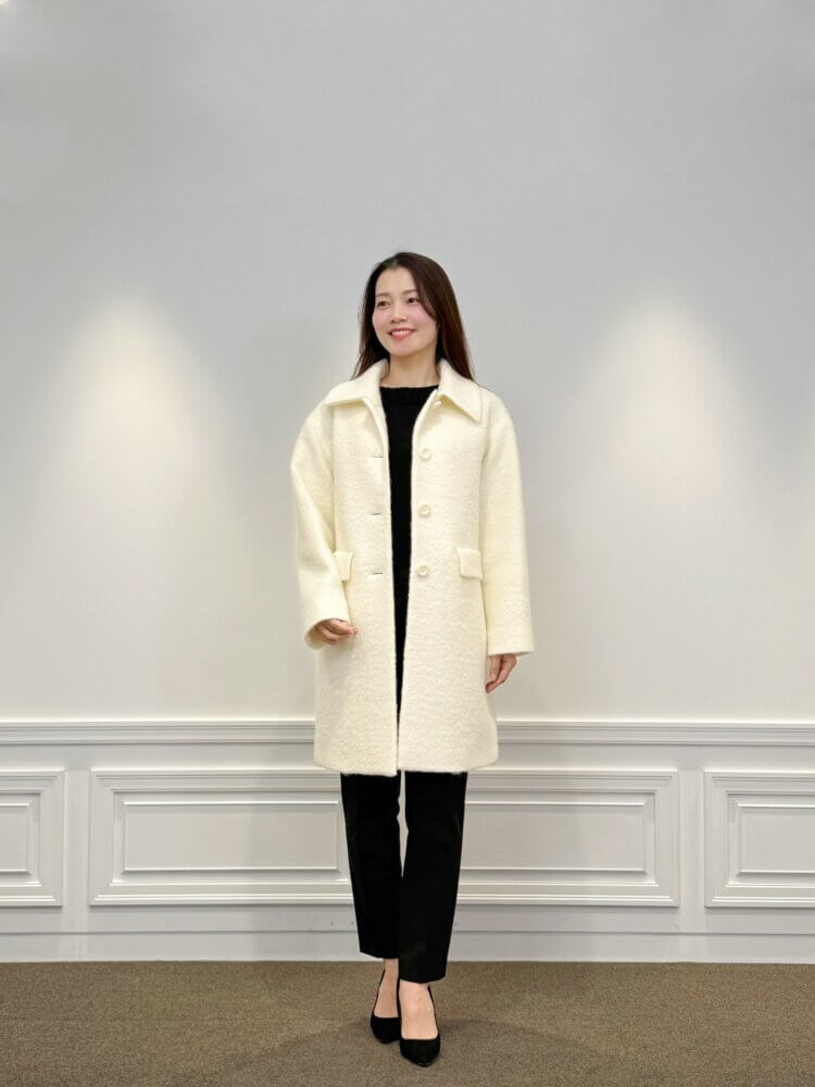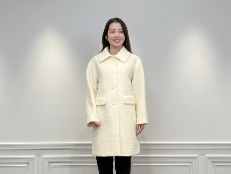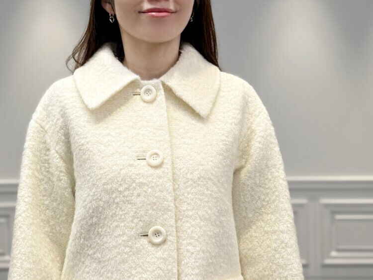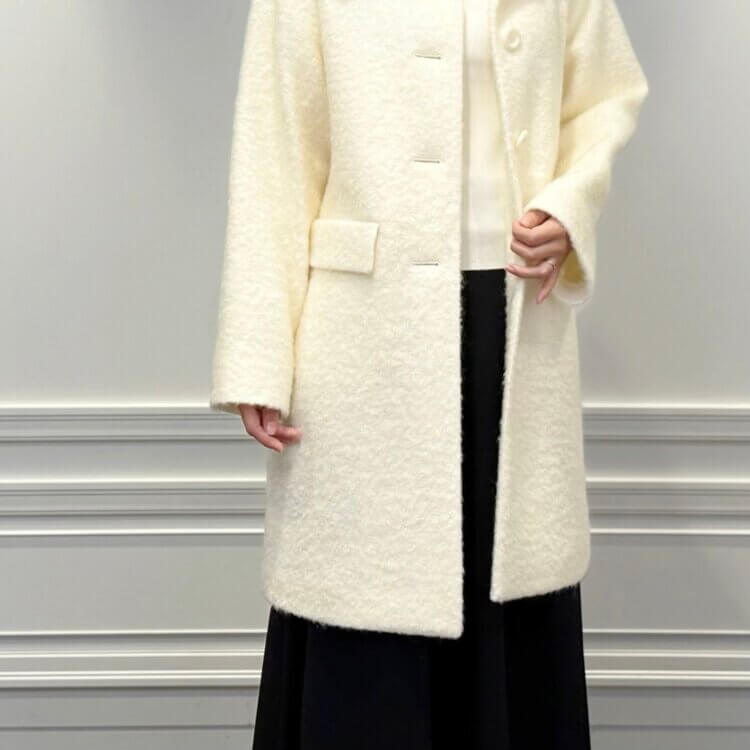 <>はループ状の糸から生まれる豊かな表面感が魅力で、ふんわりとした起毛感が冬らしい温もりを添える一着です。直線的なシルエットが全体をすっきりと見せてくれるため、重くなりがちな冬スタイルにも軽やかな印象をプラス。フラップ付きポケットやシンプルな比翼風デザインは大人の品格を引き立て、長く愛用できる端正な佇まいが魅力です。