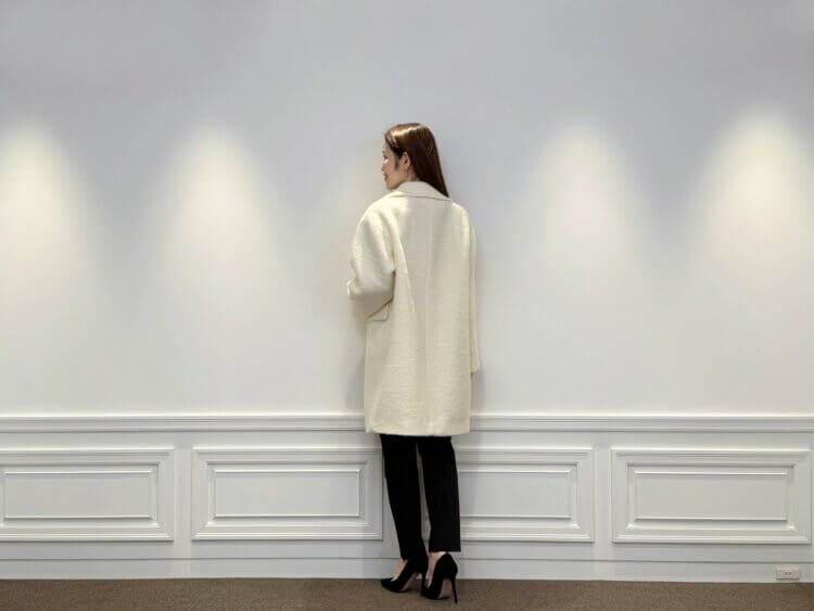 ホワイトのモヘアループコートを主役に、ブラックのトップスとテーパードパンツでまとめた洗練のモノトーンスタイルは上品な素材の表情と穏やかなコントラストが、30~40代の女性にふさわしい知的でエレガントな冬の装いをつくります。全体を細身のシルエットで整えることで、柔らかい質感のコートが一層引き立ち、都会的な洗練が漂う佇まいに。シンプルなフロントデザインが装いに端正さをプラスし、オン・オフ問わず活躍する上質コーデに仕上がっています。