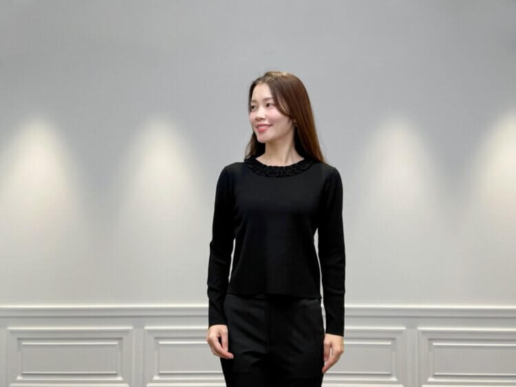 <フリルニットプルオーバー>は首元から袖にかけてあしらわれた繊細なフリルが、ブラックの持つシャープさに女性らしい優雅さを添える上質なニットです。身体にすっきりと沿う美しいシルエットがアウターの中でも映え、コートを脱いだ瞬間も気品を保つ一枚。控えめな甘さと洗練のバランスが、アッパー層の女性にちょうど良いエレガントさを演出します。
