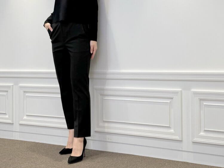 <ストレッチテーパードパンツ >は脚のラインを美しく見せるテーパードシルエットで、長時間の着用でも快適なストレッチ素材が魅力。ビジネスシーンにも対応する上質感がありつつ、日常にも溶け込む万能さが幅広いコーディネートで重宝する1本です。