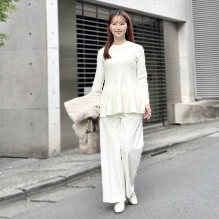 ホワイト×グレージュの組み合わせが、華やかで春らしいワントーンが今年らしいコーディネート。