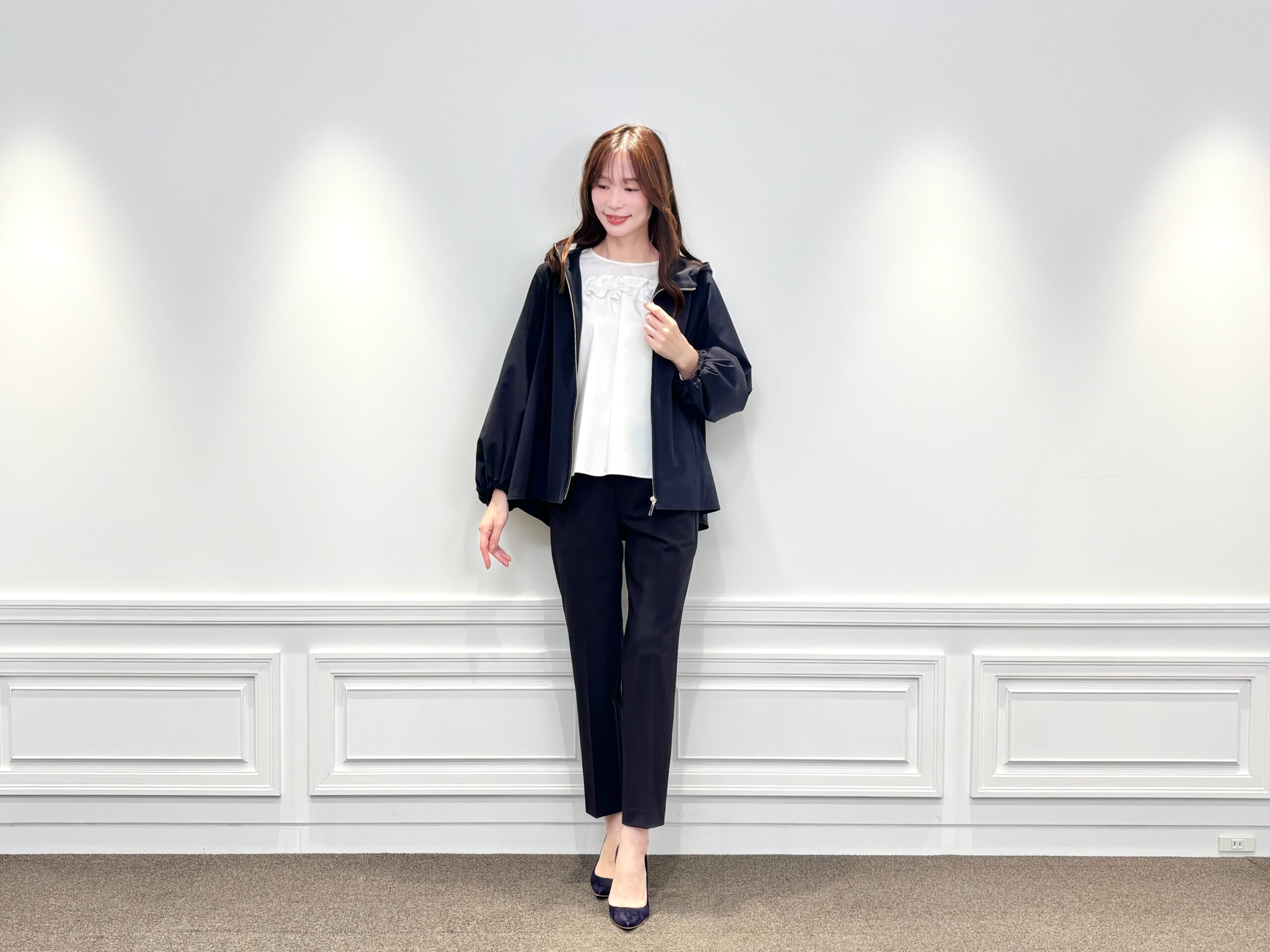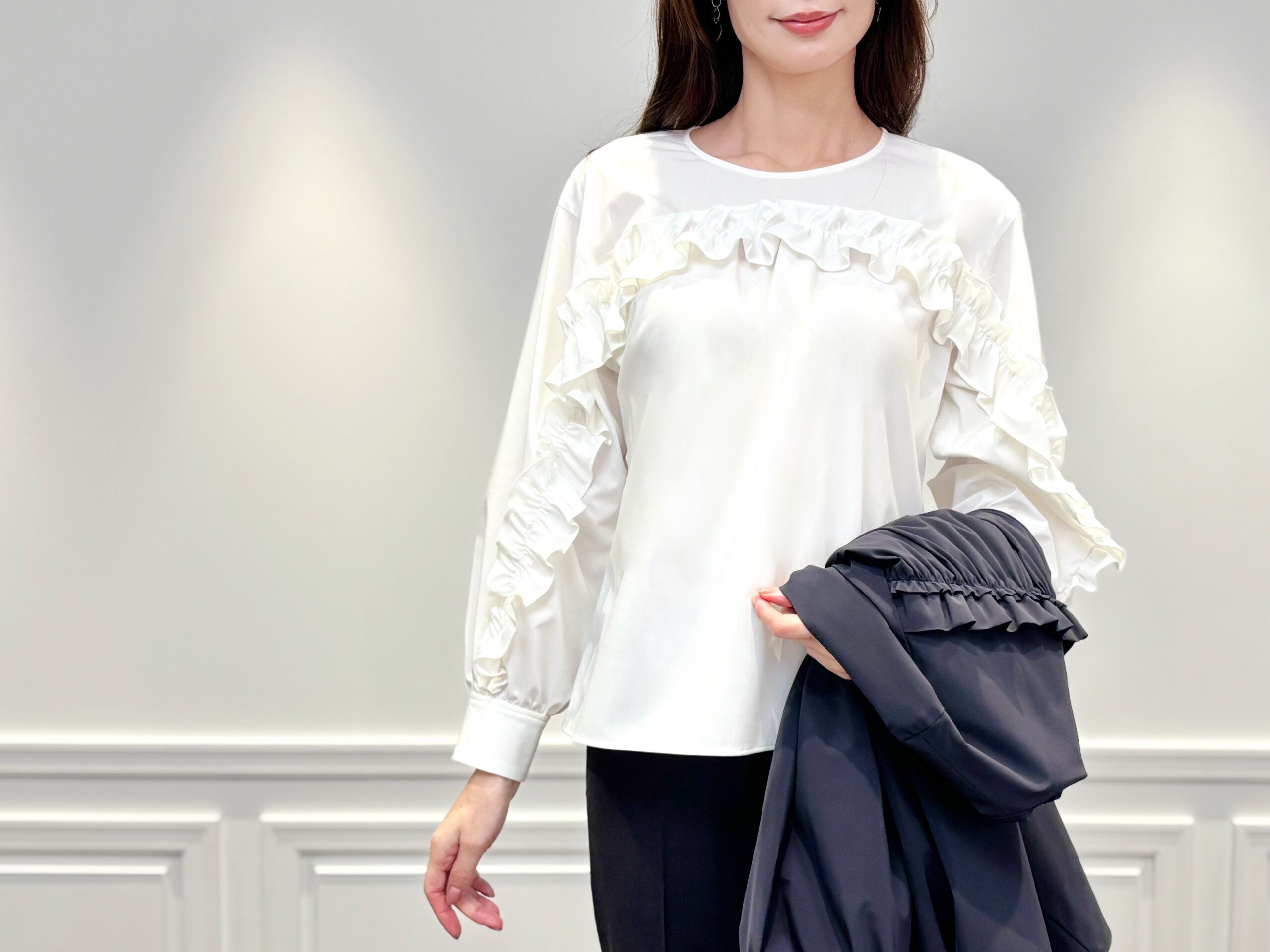 インナーにあわせた<フロントフリルブラウス>はたっぷりのフリルが顔回りを明るく昇華させてくれるアイテム。
