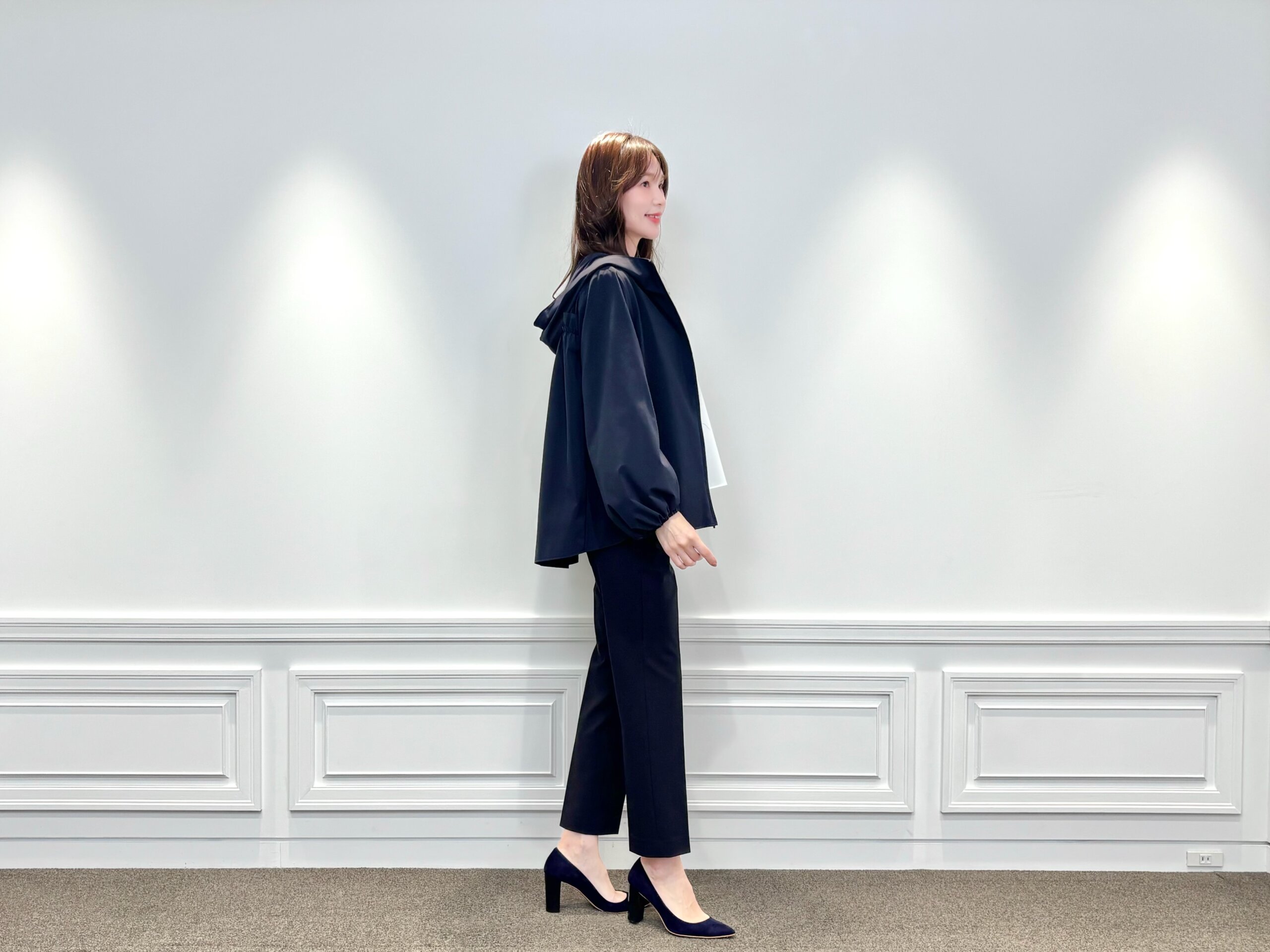 足元にはヒールを合わせて、全体をぐっとエレガントに。通勤や学校行事、きちんと見せたい日にもおすすめのスタイルです。