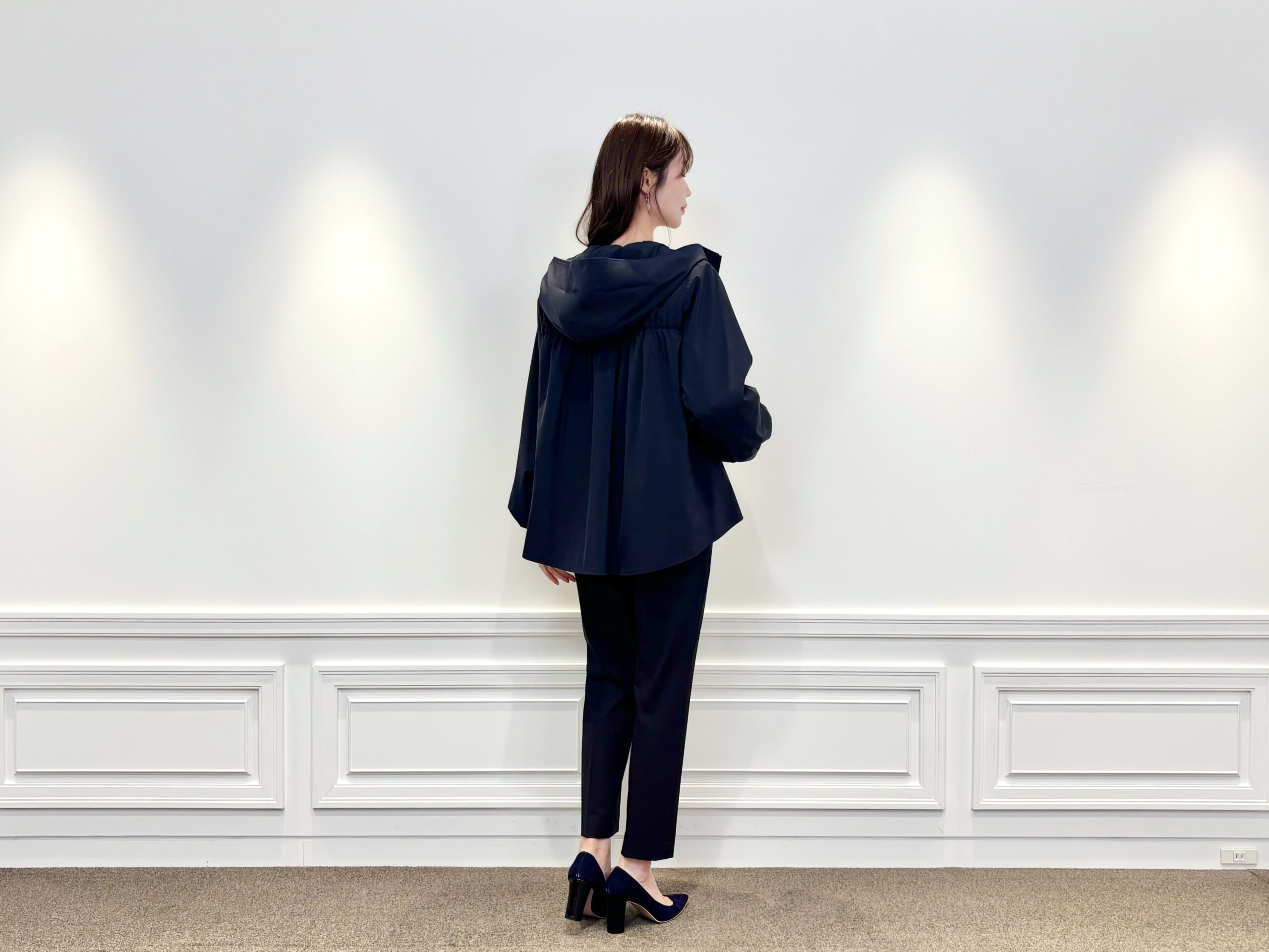 ネイビーのナイロンパーカーとテーパードパンツを合わせた、上品で清潔感のある大人コーデ。軽やかなナイロン素材のパーカーは、ほどよい抜け感を演出しつつも、全体をきれいめにまとめてくれます。