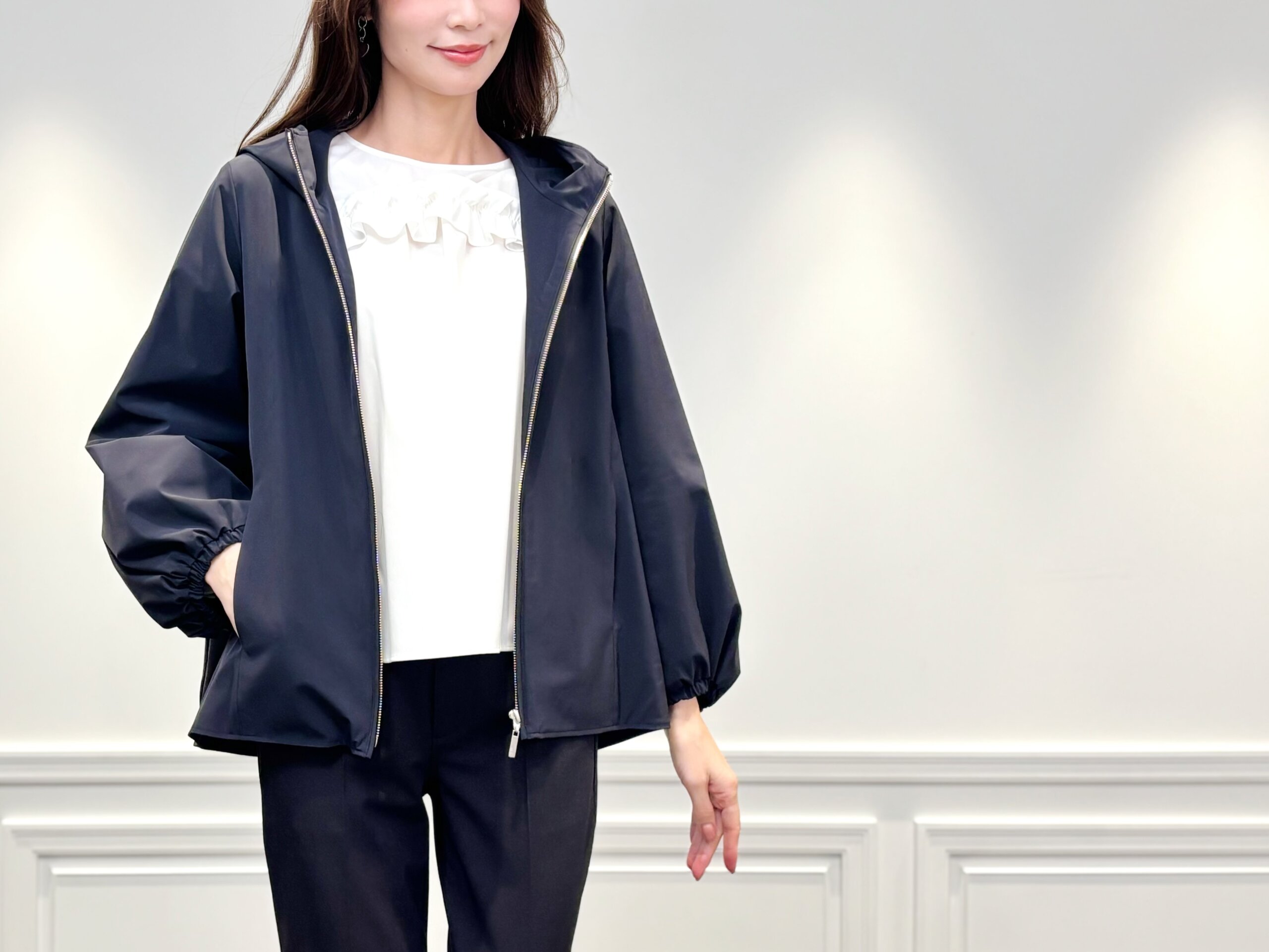 ふんわりと広がるシルエットと袖口のボリュームスリーブが可愛らしく女性らしい華やかさ演出します。撥水加工を施したナイロン素材が急な天候にも対応でき、お子様と過ごす日や通勤コーデに重宝すること間違いなし!