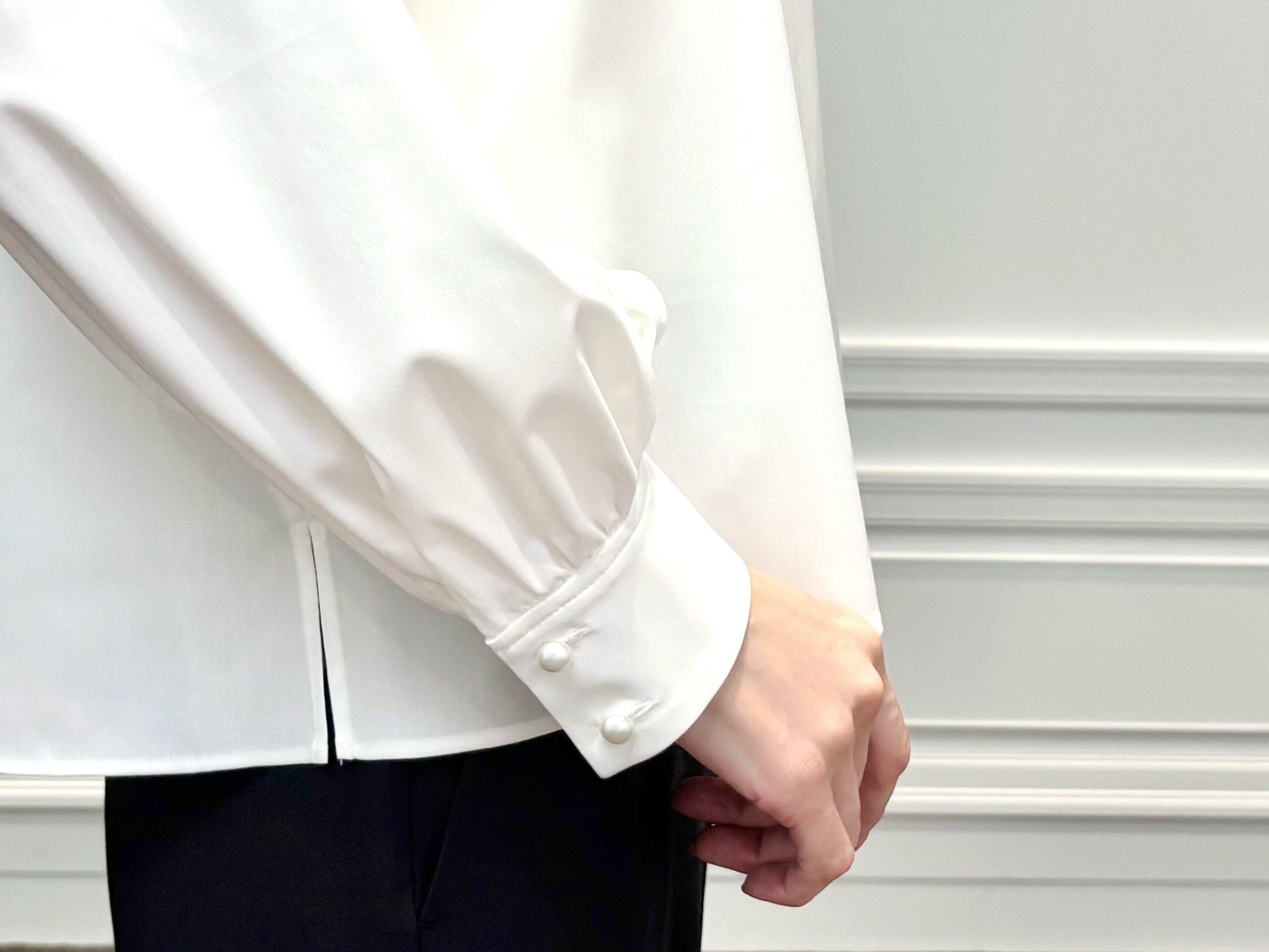 カフスに施されたパールボタンが繊細な輝きを放つアクセントになり、ウォッシャブル仕様でしわになりにくいストレッチ素材も嬉しいポイントです◎