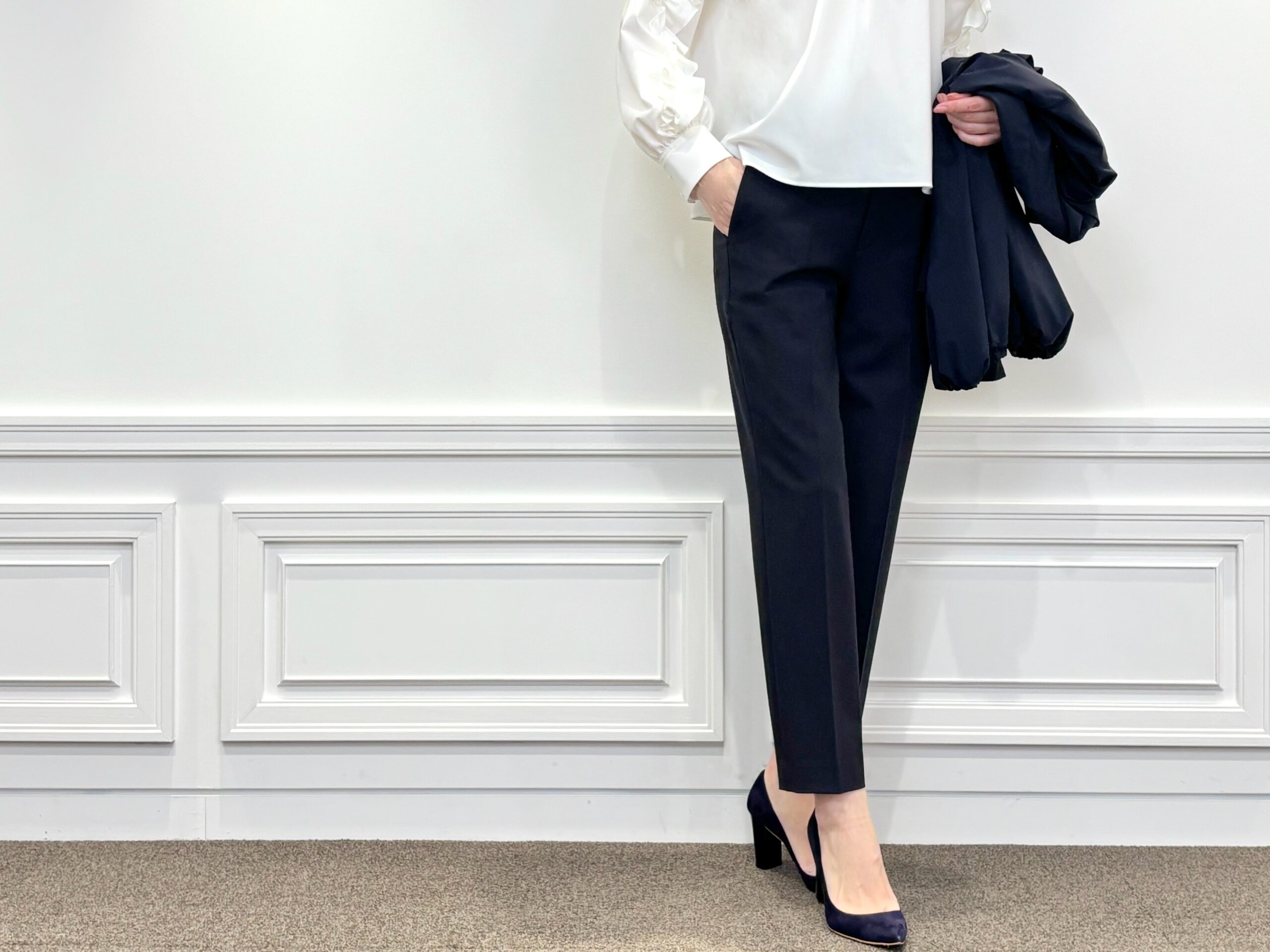 脚をすっきりと美しく魅せるこだわりのシルエットが、端正な印象を添えるアイテム。季節を問わず幅広いシーンに、知的な清潔感ある装いへと導いてくれます。