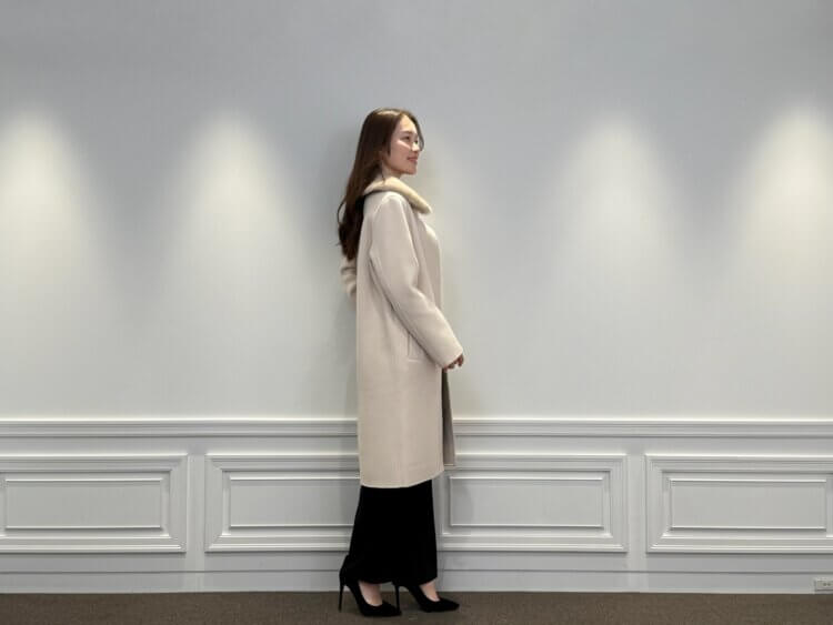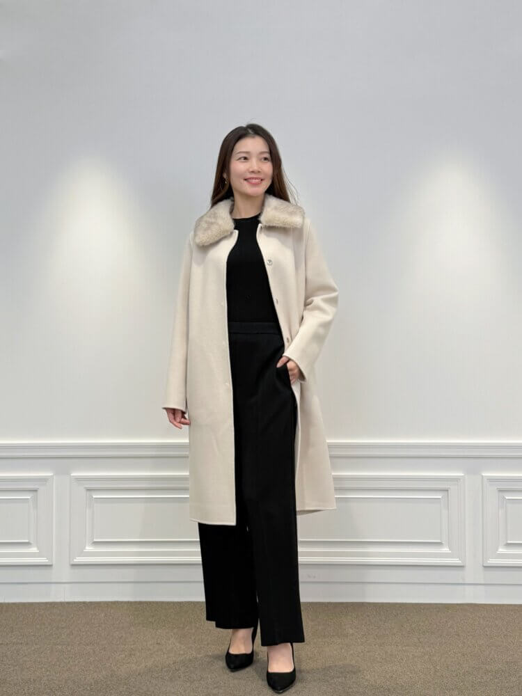 柔らかなベージュのファーカラーロングコートを主役に、インナーとパンツをブラックでまとめることで、上品な奥行きが生まれる冬のニュアンススタイルに仕上げています。コートの穏やかな色調がブラックの端正さを中和し、エレガントで知的な大人のバランスへ。厚みのある素材同士でも重たく見えず、シルエットにメリハリが生まれるのは、上質な生地感と計算されたラインの組み合わせならでは。シーンを問わず洗練された雰囲気を保てるコーディネートです。