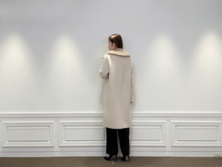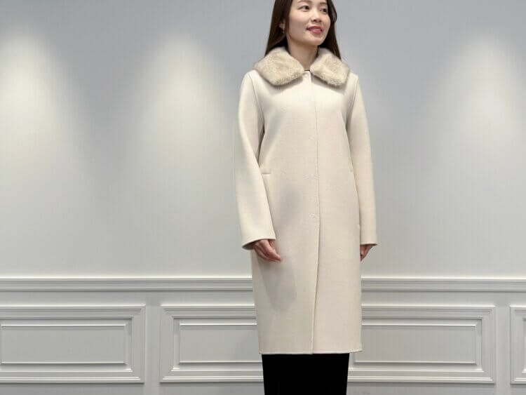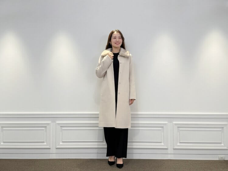<ファーカラーロングコート>はふんわりとしたファー襟が季節感を添えながら、直線的なシルエットが全体をすっきりと見せてくれるエレガントなロングコート。軽やかな素材が歩くたびに自然な揺れを生み、ベージュの柔らかな色合いが女性らしい品の良さを引き立てます。ブラックとの相性も良く、冬の装いに温度感と華やぎを添える一枚です。