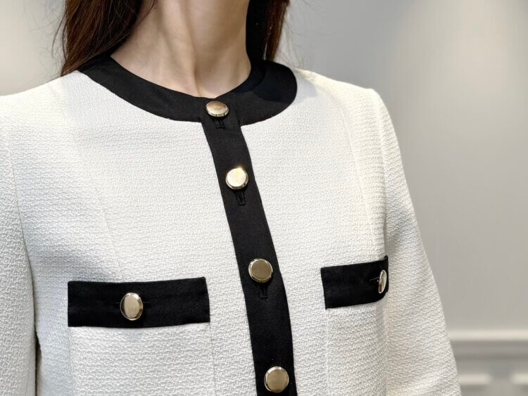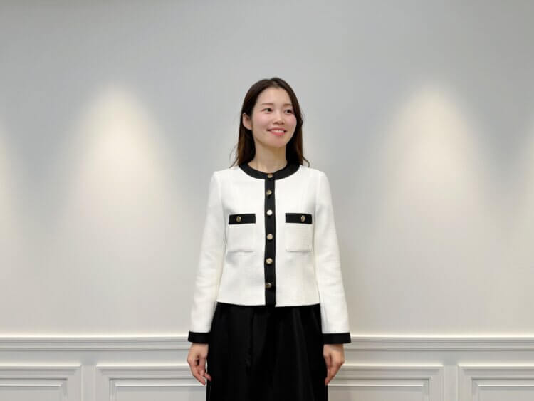 <ゴールドボタン配色ツイードジャケット>は、コーディネートに華やぎと品格を添える名品。WHITEのツイードにBLACKの配色を効かせたバイカラーデザインが、クラシカルでありながら洗練された印象を与えます。フロントに並ぶゴールドボタンが顔まわりを明るく演出し、羽織るだけで装いを格上げ。ワンピーススタイルはもちろん、単品使いでも幅広いシーンに対応できる、汎用性の高い一着です。