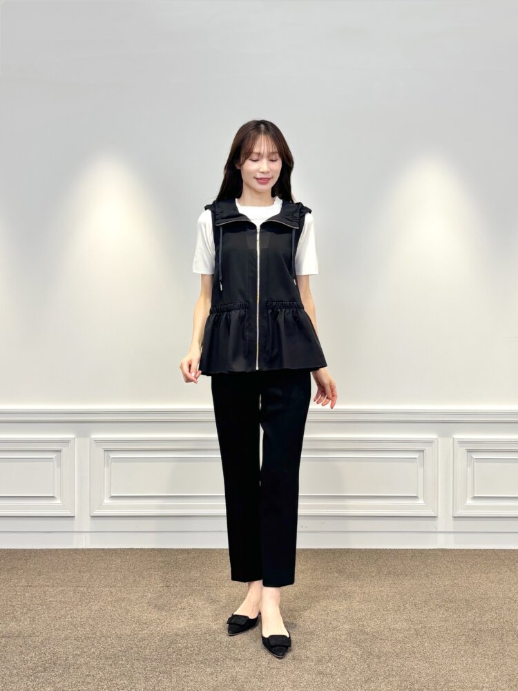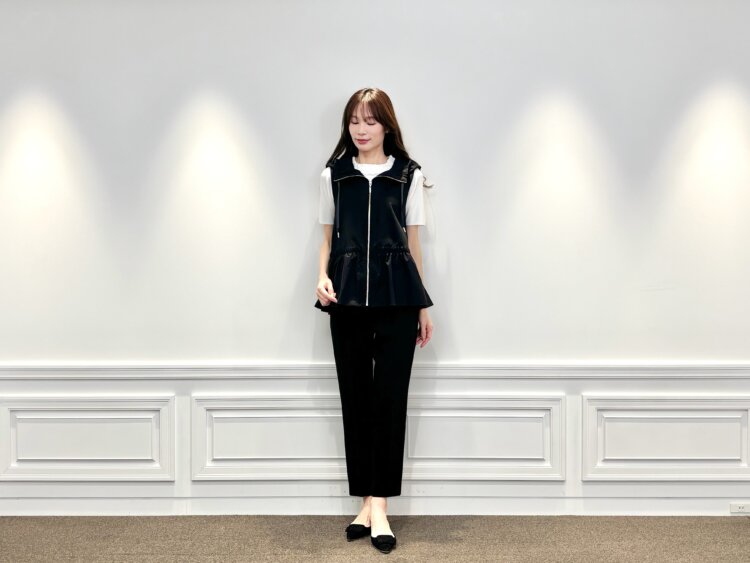 白のニットプルオーバーに、黒のジップアップペプラムフーディジレを重ね、ダブルクロス素材のセンタープレステーパードパンツを合わせた、大人女性にぴったりの上品カジュアルです。