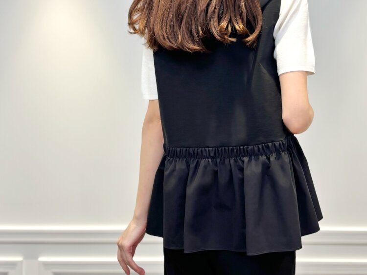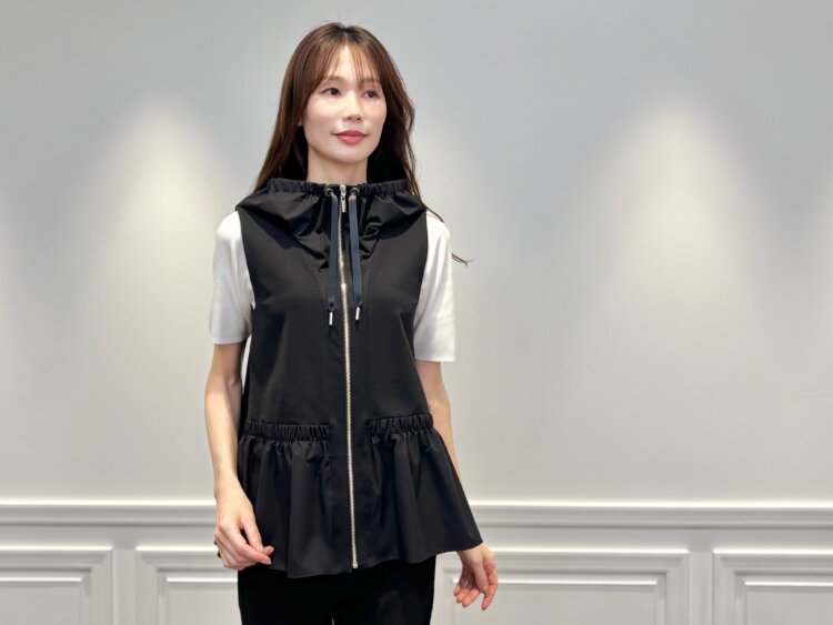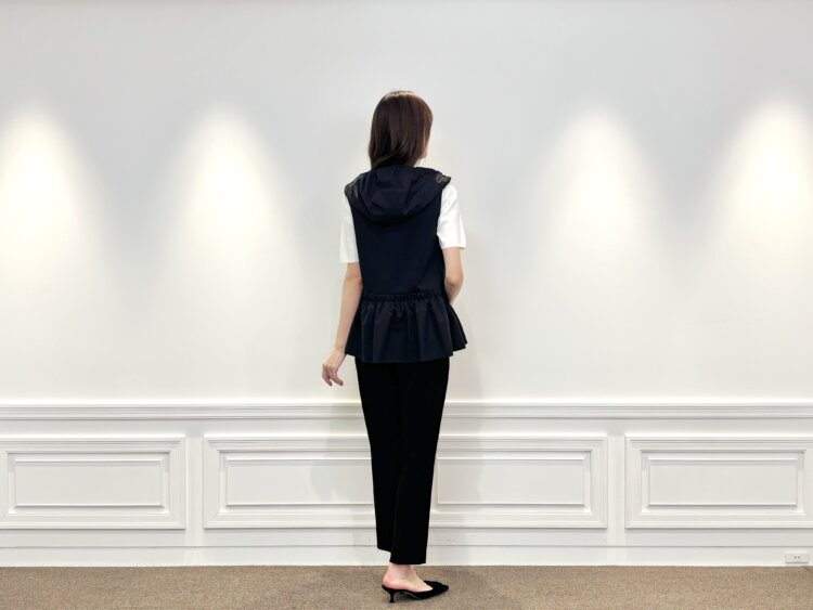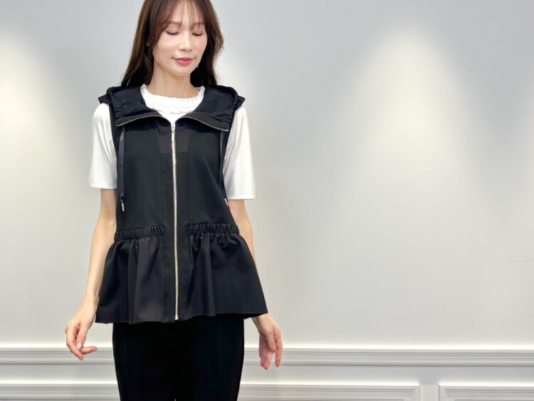顔まわりを華やかに見せてくれるフリルネックのニットは、シンプルながらも女性らしさを引き立てる一枚。そこに羽織ったジレは、ウエスト位置からふんわり広がるペプラムシルエットで、自然とスタイルアップを叶えてくれる優秀アイテムです。さらにフード付きデザインにほどよい抜け感が感じられ、きちんと感の中にも洒落感をプラスします。