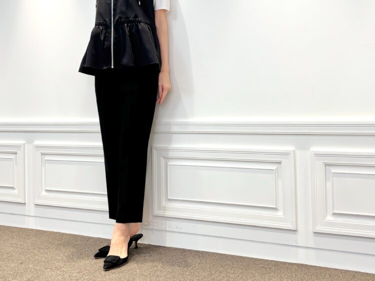 ボトムには、美しいストレートラインが端正な佇まいのテーパードパンツですっきりとまとめます。しなやかな落ち感と上質なダブルクロス素材が快適な穿き心地を叶えながら、きちんと感のある美しいシルエットをキープ。シンプルだからこそ着回し力が高く、ワードローブに一着あると重宝するおすすめのパンツです。