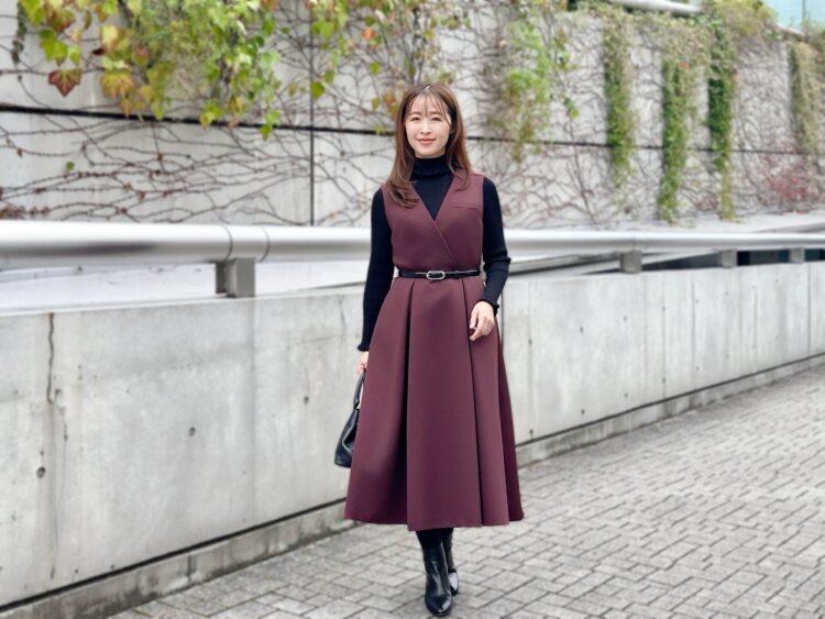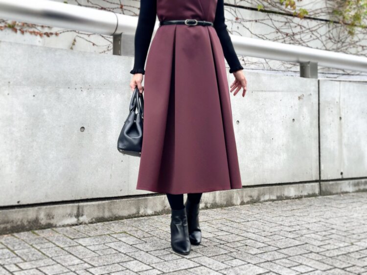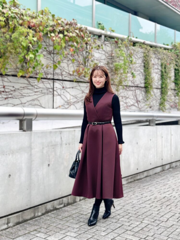 バーガンディの色味が主役になりつつ、ブラックのニット&ブーツで全体を引き締めると、日常使いしやすいのに特別感もある“冬のきれいめコーデ”が完成します。フィット&フレア好きの方にはもちろん、ホリデーらしい華やぎを楽しみたい方にもおすすめの一枚。