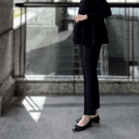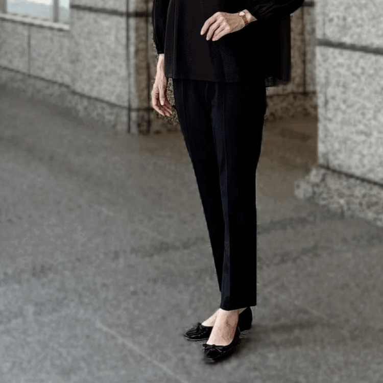 トップスは、ブラック・ダークネイビー・グレーの3色展開!どれもベーシックで着こなしやすいお色です。私が着用しているのは、グレーで、落ち着いた発色で肌に透明感を与えてくれます。スカートはブラックで、タイツとパンプスとブラックでシックで統一感のある配色に。