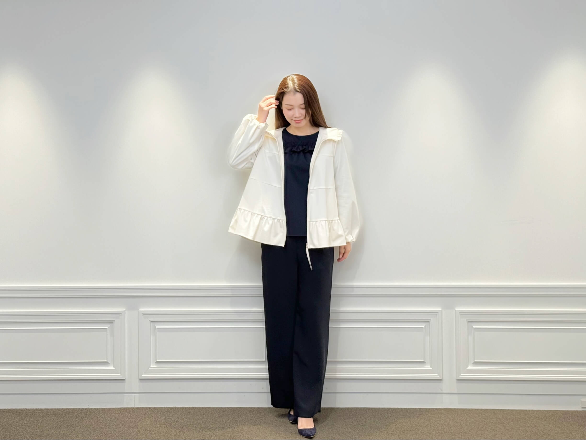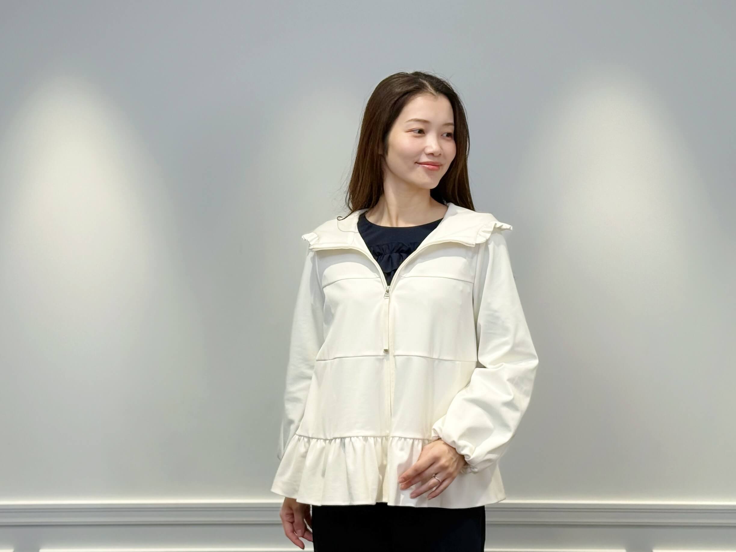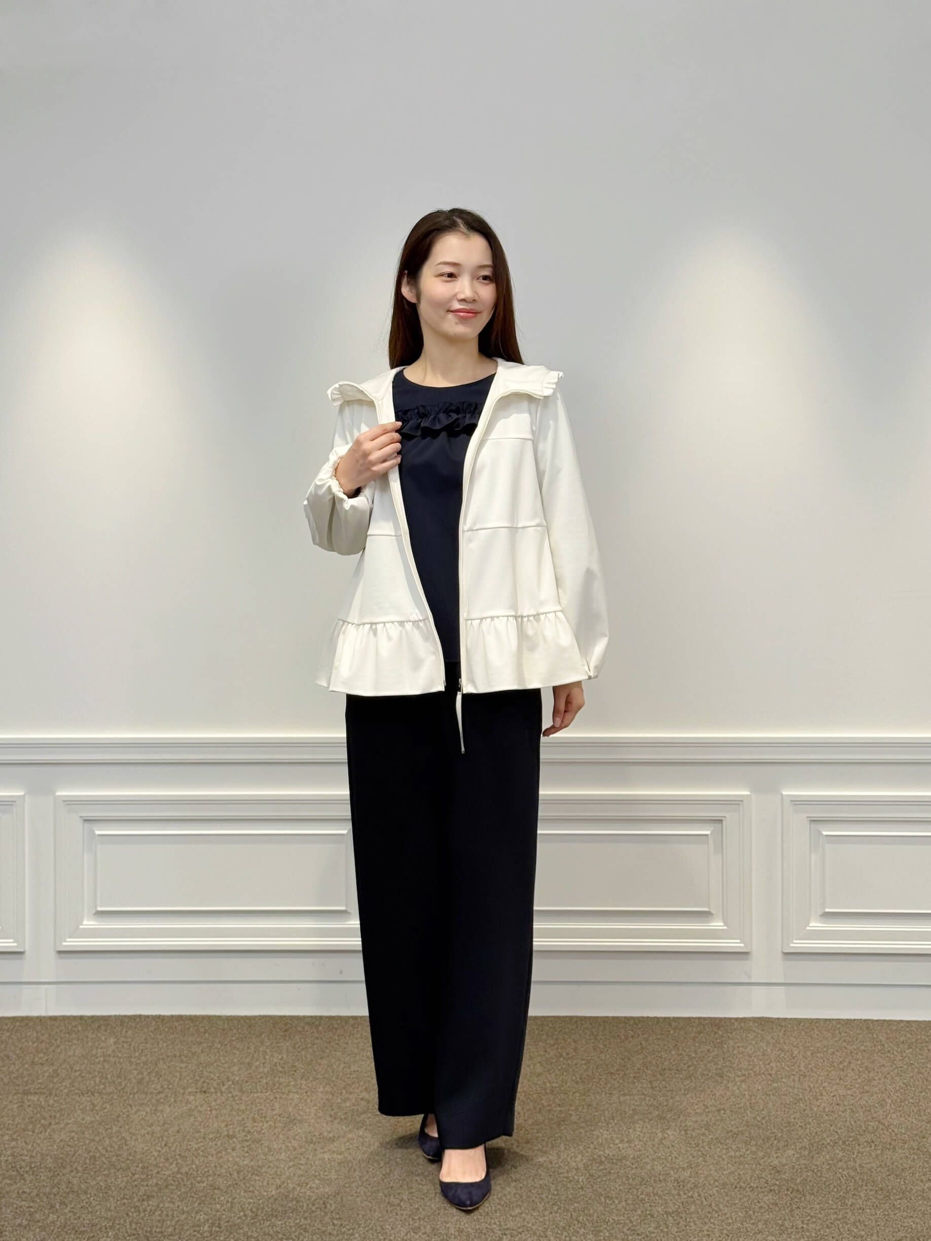 インナーには、フロントのフリルが印象的な<フロントフリルブラウス>をセレクト。柔らかく落ち感のある素材が上品に揺れ、ネイビーの深みが全体を引き締めてくれます。ジップを開けてフリルをのぞかせれば、華やかで奥行きのある印象に。