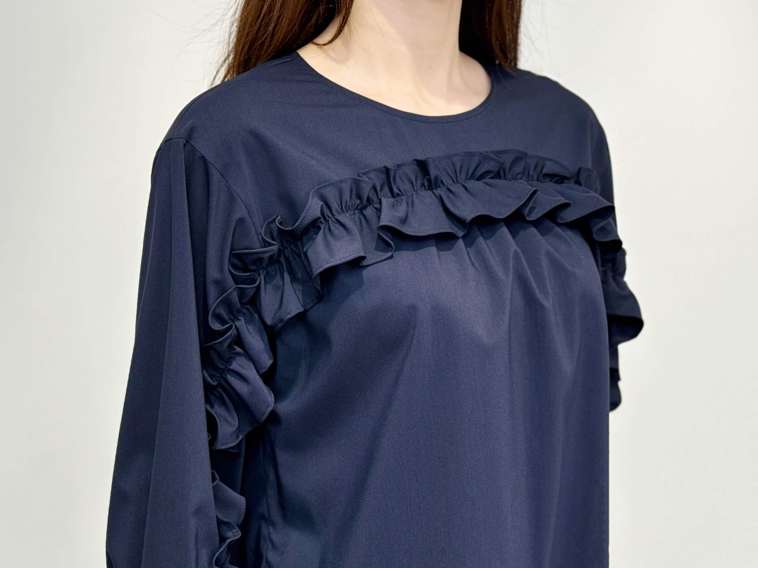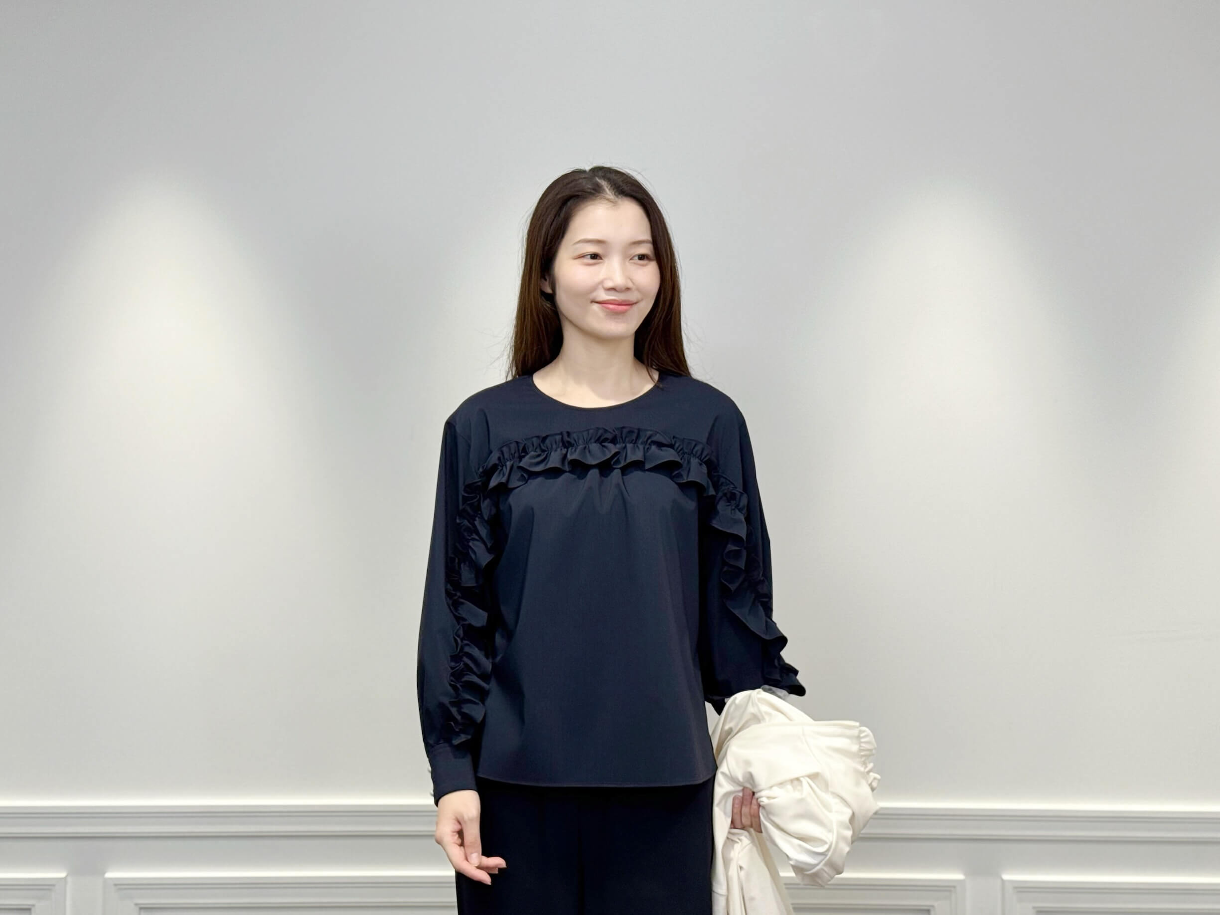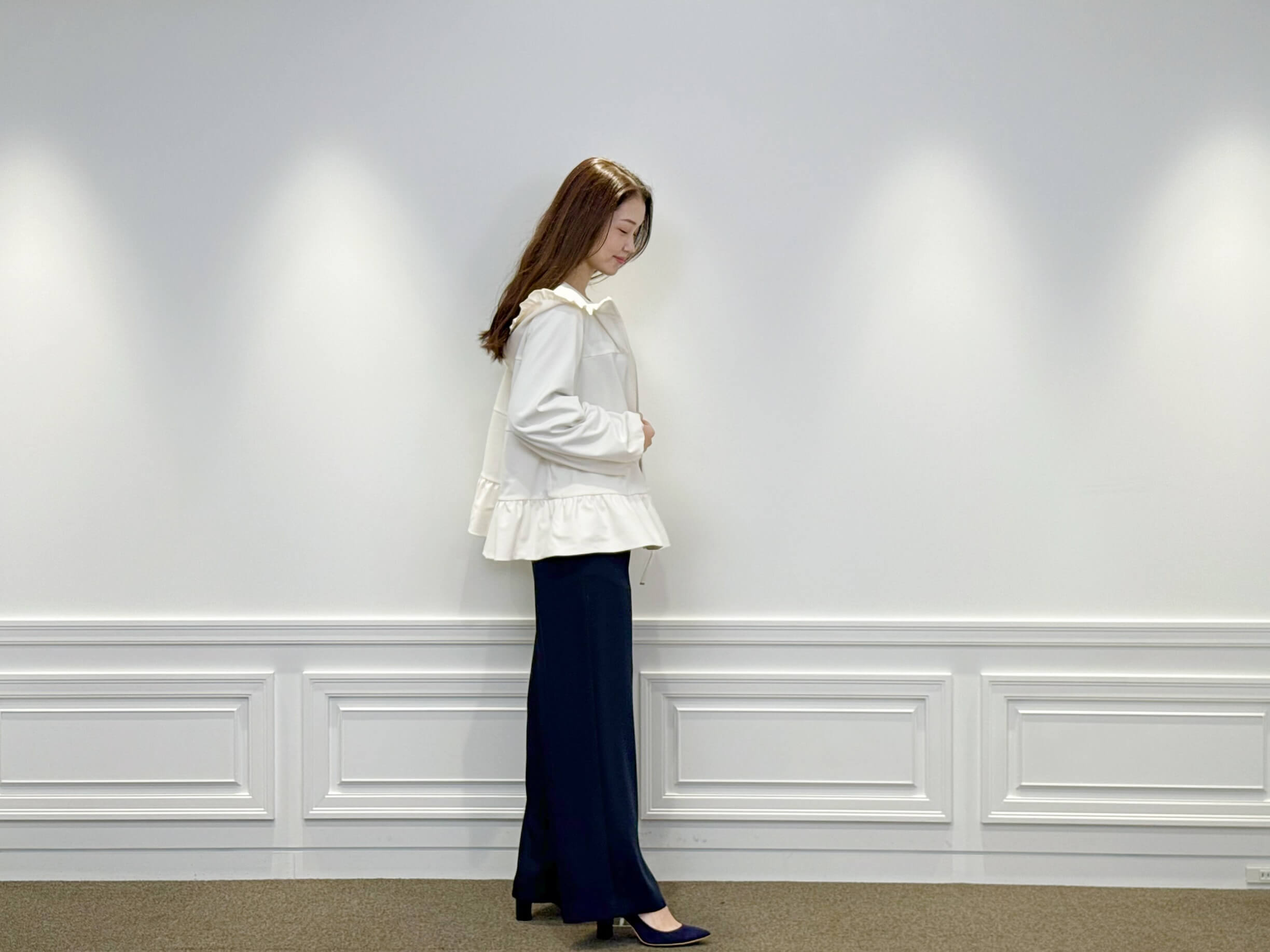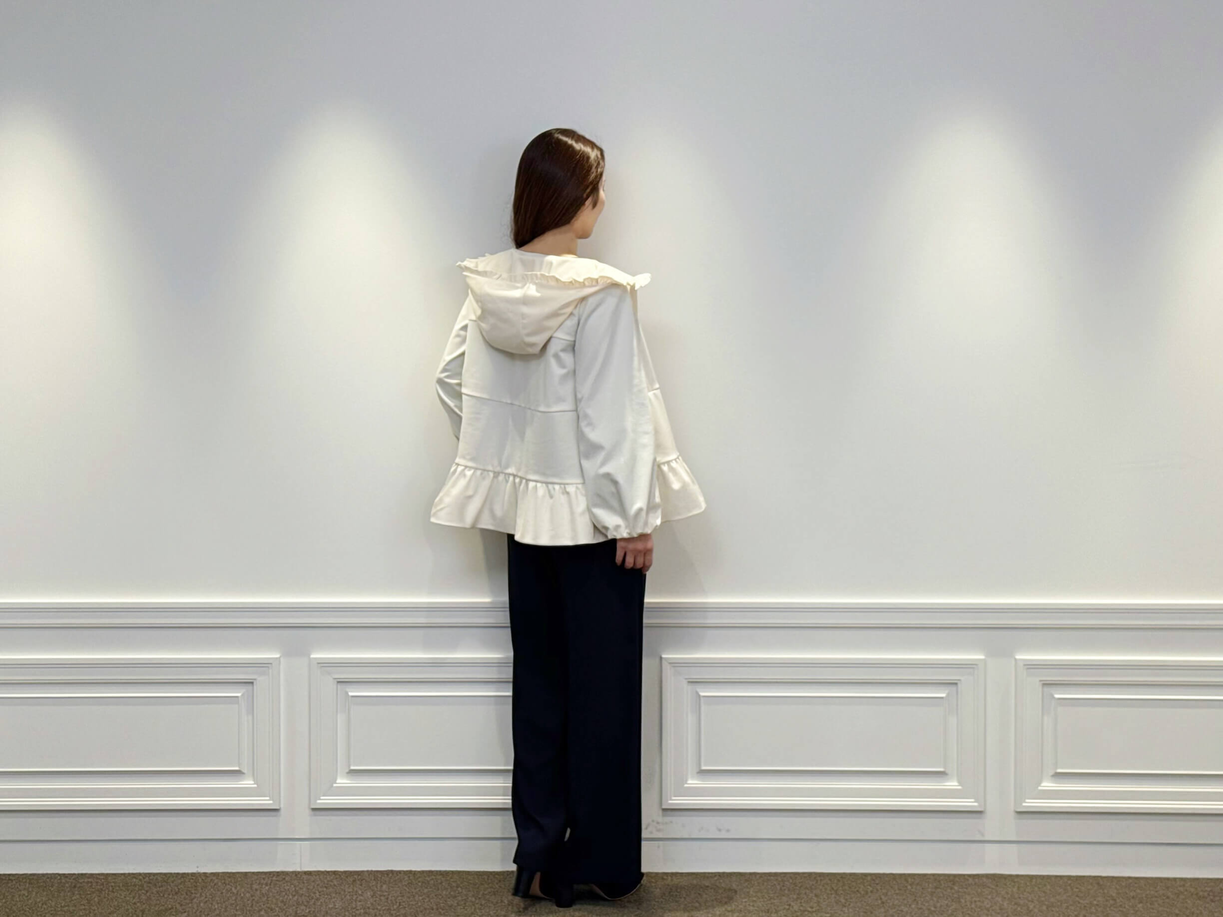 インナーには、フロントのフリルが印象的な<フロントフリルブラウス>をセレクト。柔らかく落ち感のある素材が上品に揺れ、ネイビーの深みが全体を引き締めてくれます。ジップを開けてフリルをのぞかせれば、華やかで奥行きのある印象に。