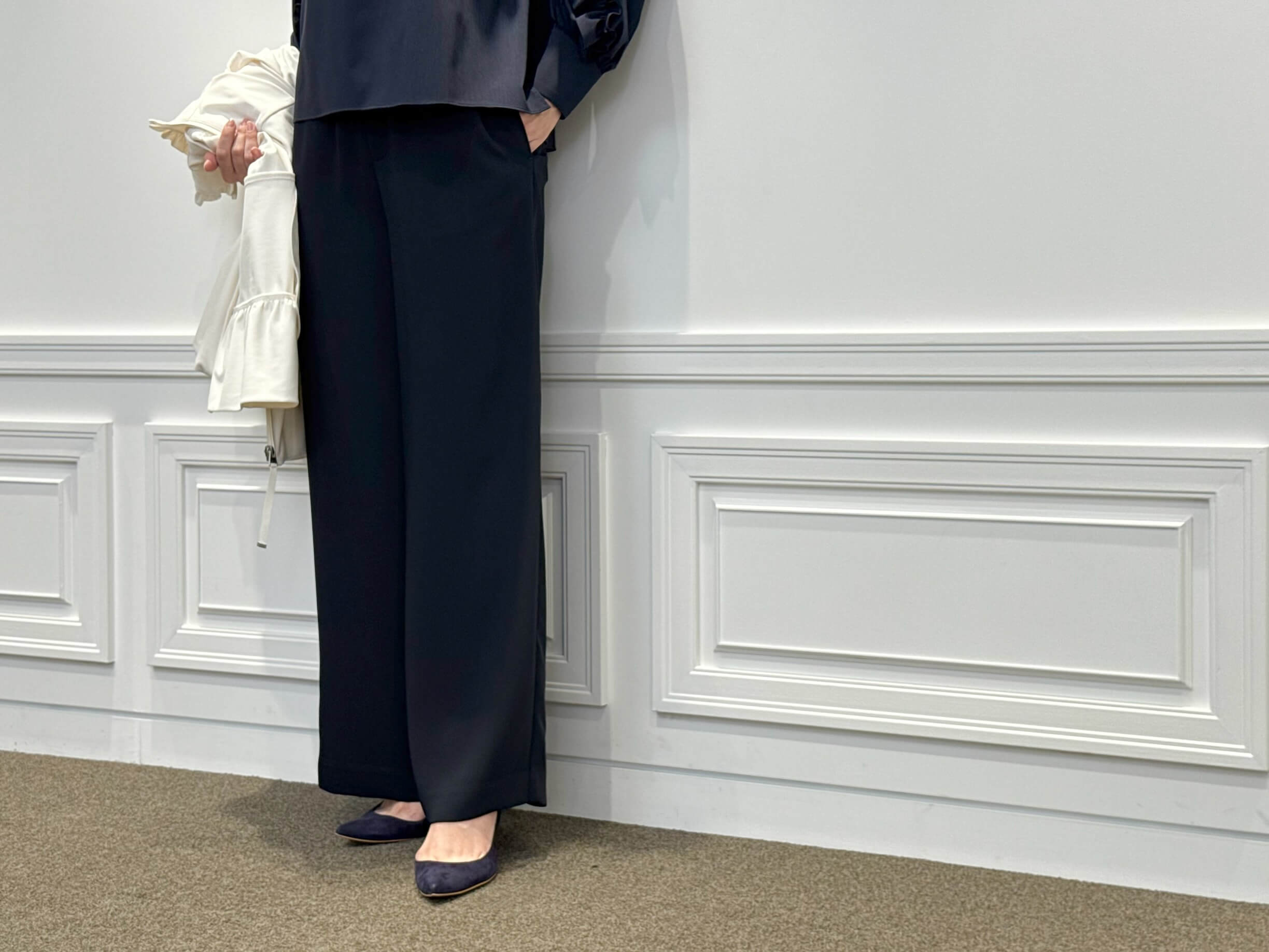 ボトムには、動きやすさときちんと感を兼ね備えた<ダブルクロスプルオンワイドパンツ>を合わせて。すとんと落ちる美しいシルエットが、リラックス感の中にも知的な印象を添えます。ネイビーで統一感を出しつつ、清潔感のある上品カジュアルが完成します。