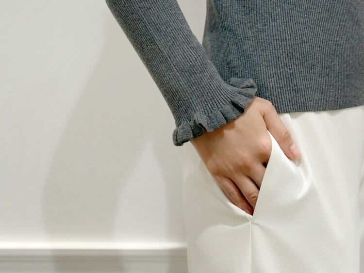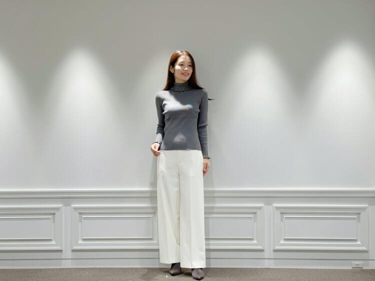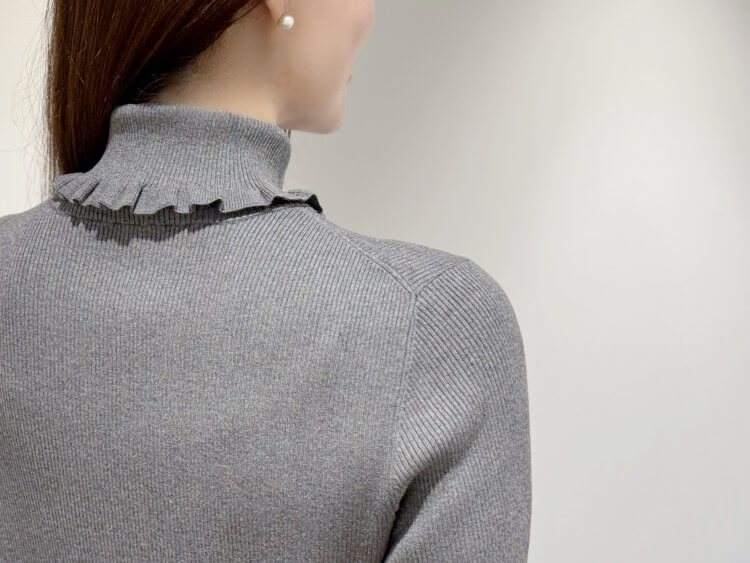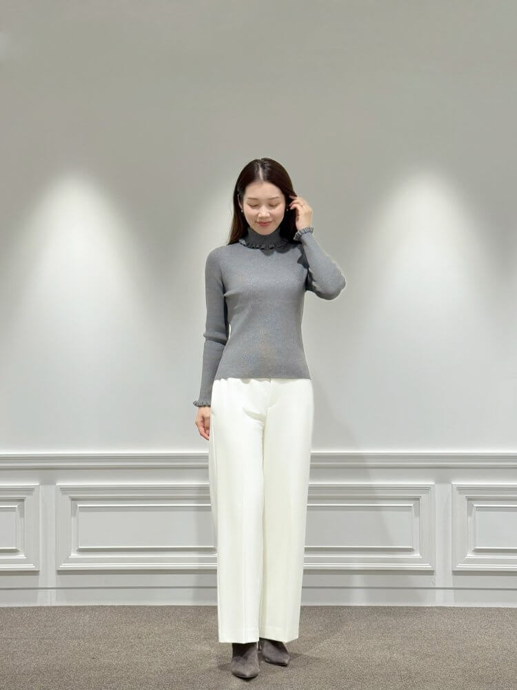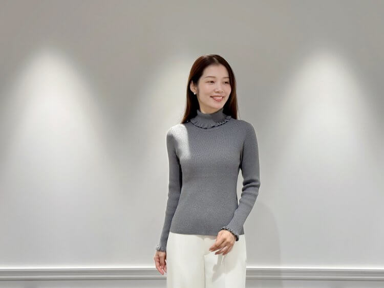 しなやかなリブ編みが美しい<フリルリブニットプルオーバー>は、柔らかなレーヨンベース素材が肌に心地よくフィットし、着る人の動きに寄り添う上品な一枚。襟ぐりと袖口にあしらわれたフリルが、控えめながらも女性らしい表情を添えます。程よく身体に沿うシルエットがシンプルなパンツスタイルを格上げし、上質な日常を感じさせる着こなしに導きます。