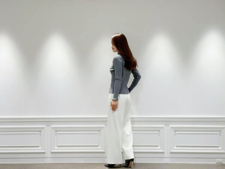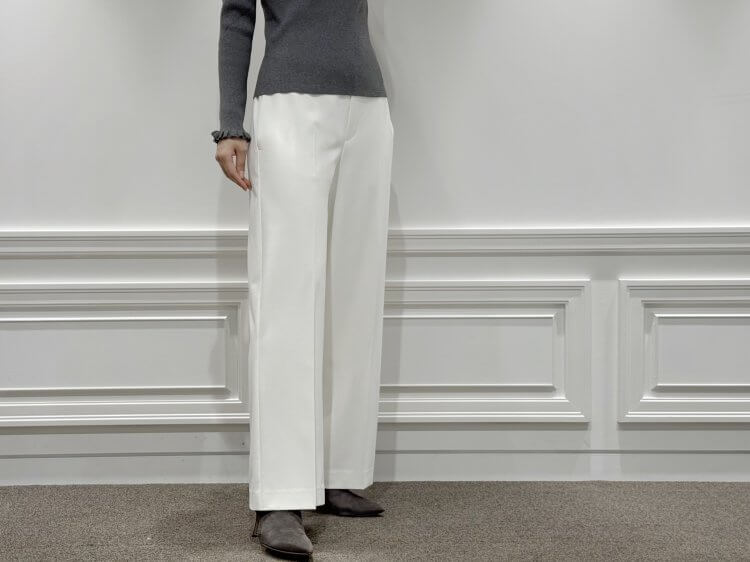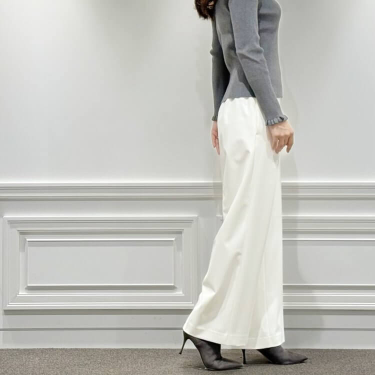 <センタープレスストレートワイドパンツ>は、美しいシルエットと快適さを兼ね備えたエレガントな定番。縦のラインを強調するセンタープレスが脚をすらりと見せ、凛とした印象を演出します。UVカットや防シワ、ストレッチ性に優れた機能素材で、長時間の着用も快適。ホワイトの清潔感と程よいハリのある素材が、ニットの柔らかさと好バランスを描きます。