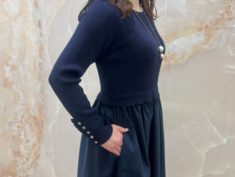 上身頃は伸縮性のあるリブニット、スカート部分には上品な光沢感のある布素材を組み合わせた、異素材コンビのワンピース。程よく身体に沿うニットトップスとウエスト下から広がるフレアシルエットが、女性らしくきれいなラインを演出します。