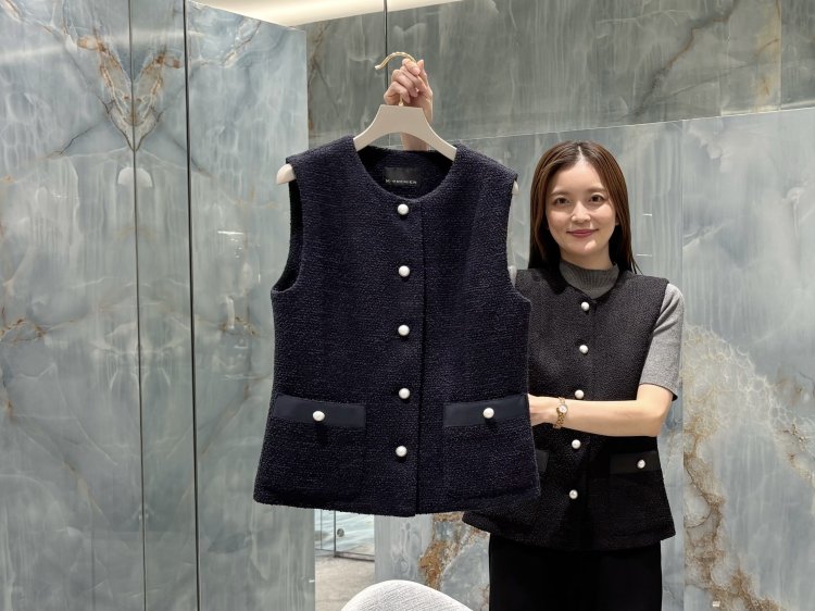 クラシカルなツイード調の表情と、パールボタンの上品な輝きが魅力のニットジレ。