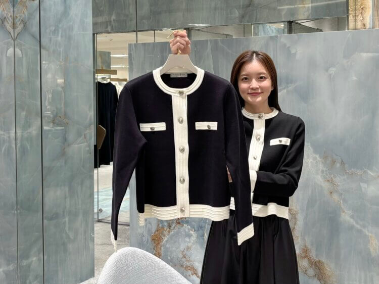 クラシカルなバイカラーデザインが、纏うだけで上品さを引き立てるニットジャケット。
