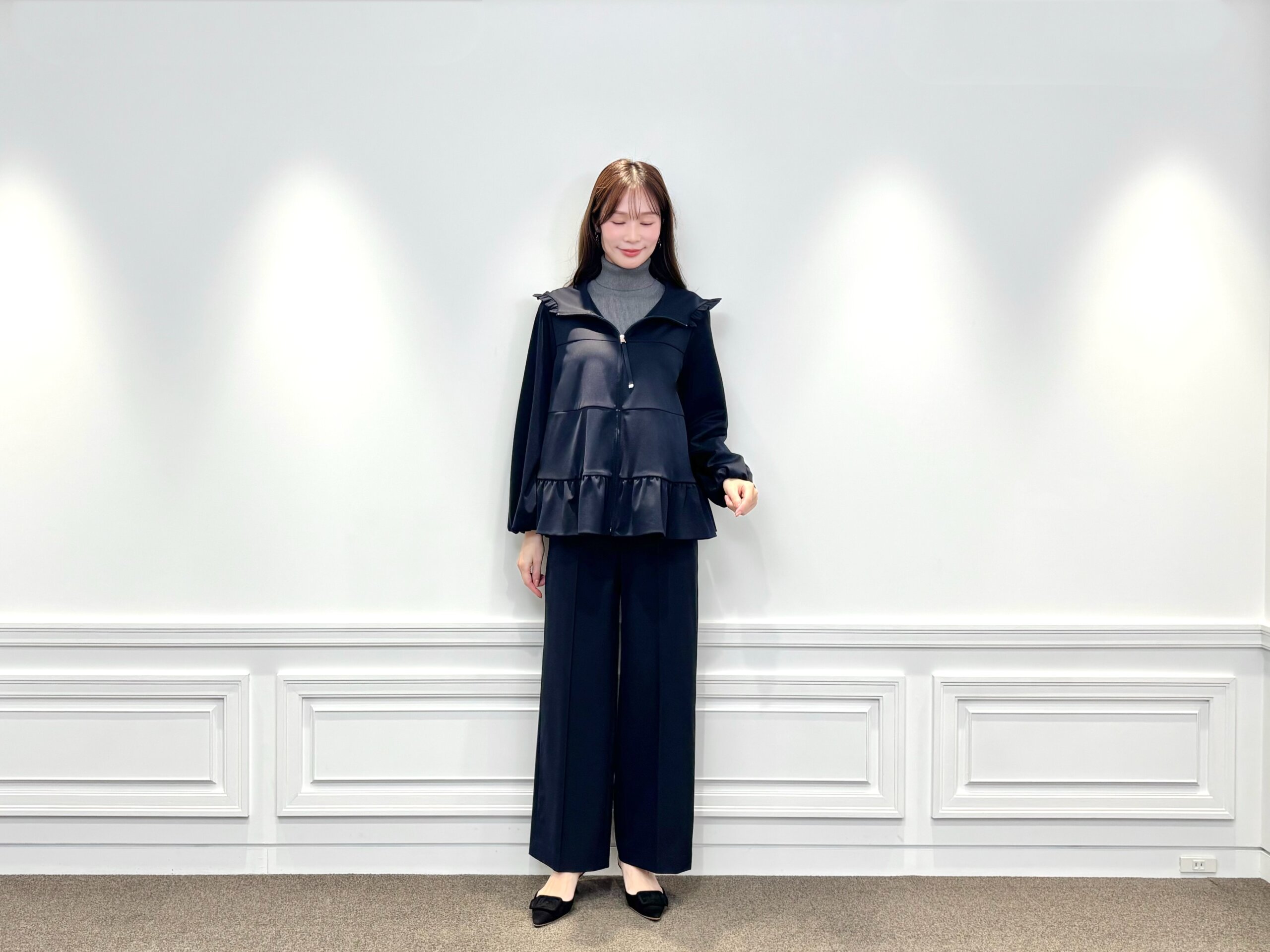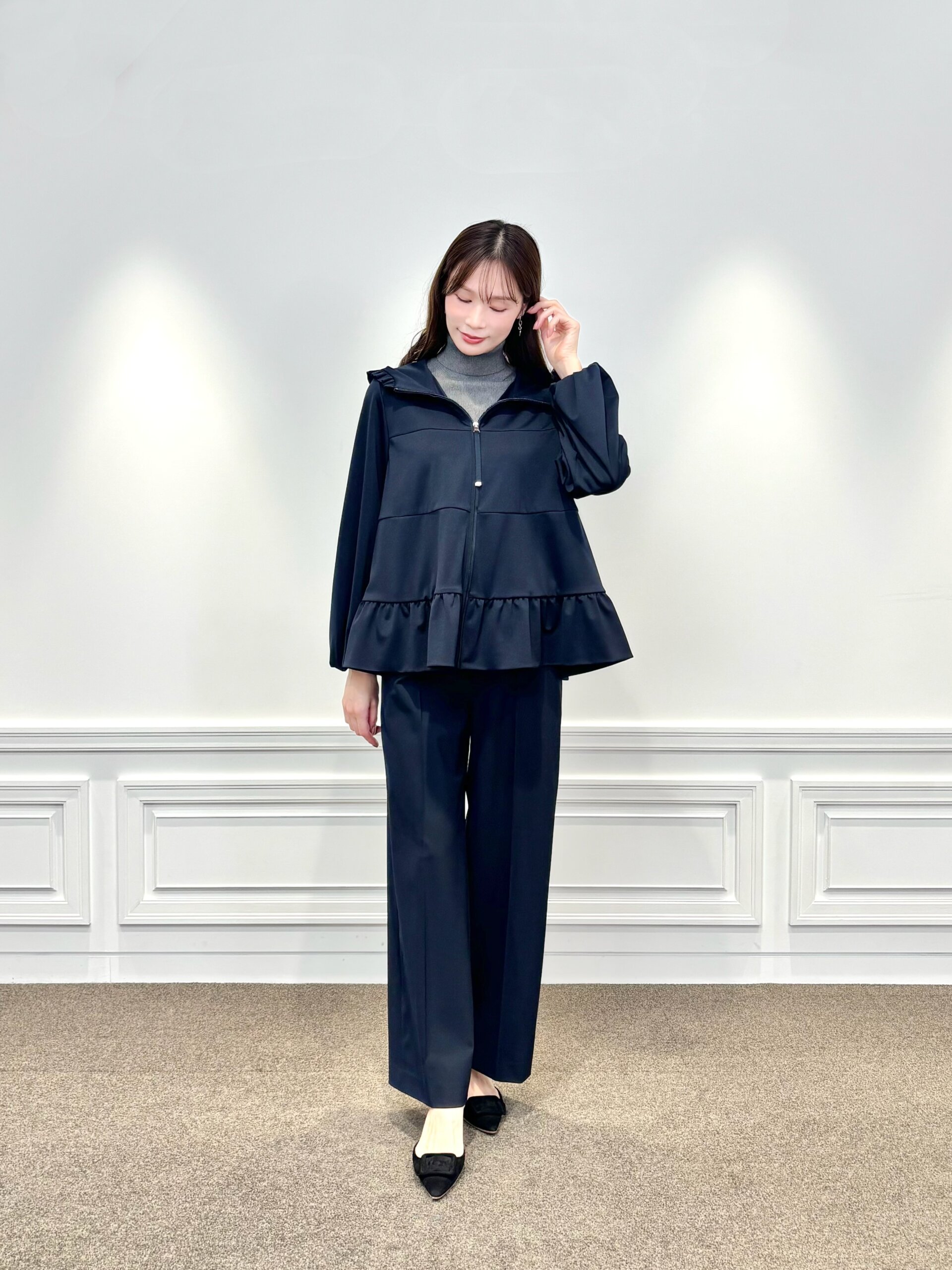 フリルがポイントのポンチ素材ジップアップパーカーに、ワイドパンツを合わせた上品カジュアルスタイル。ほどよいハリ感のあるポンチ素材がシルエットをきれいに見せ、ラフになりすぎないのが魅力です。