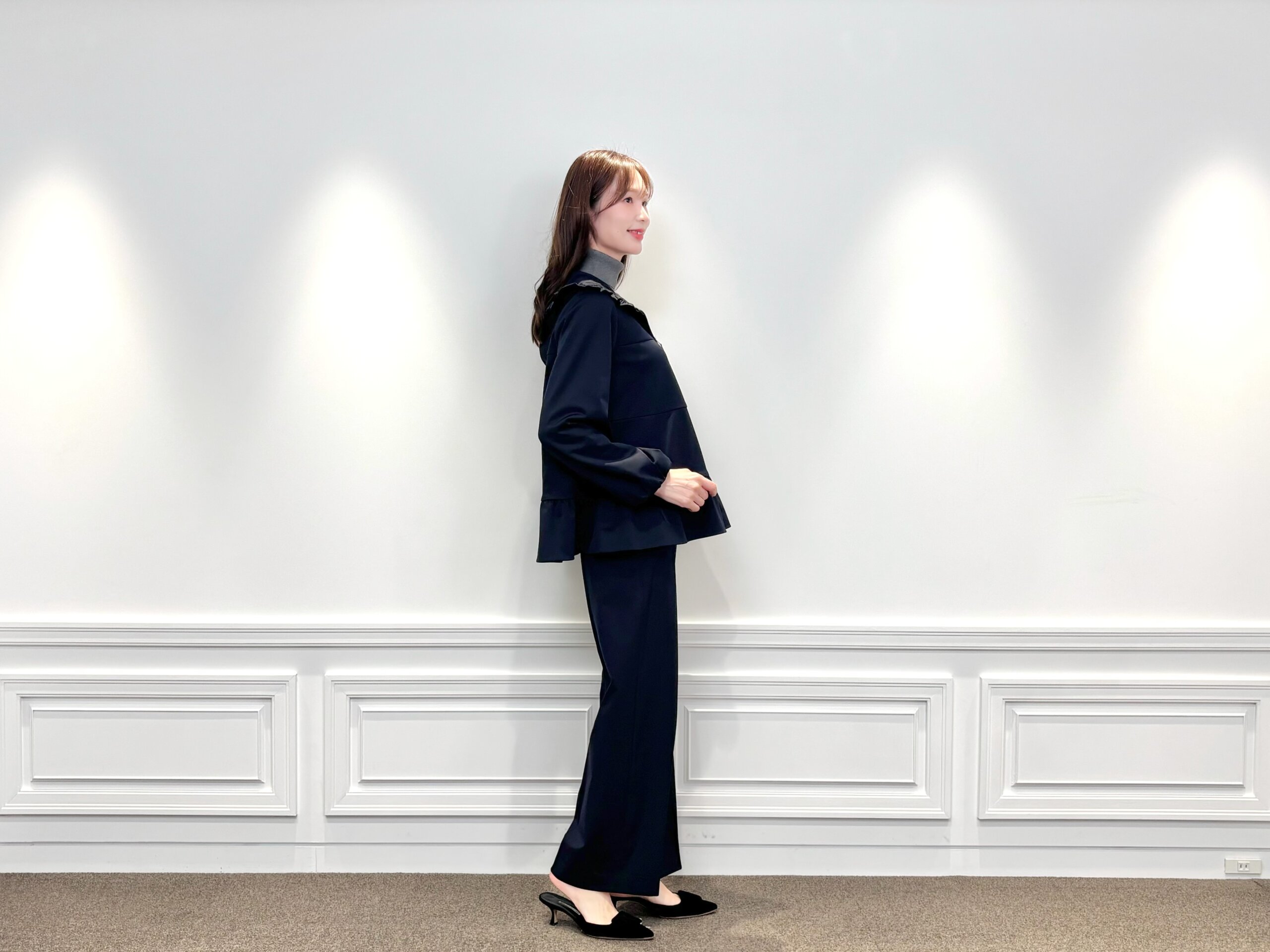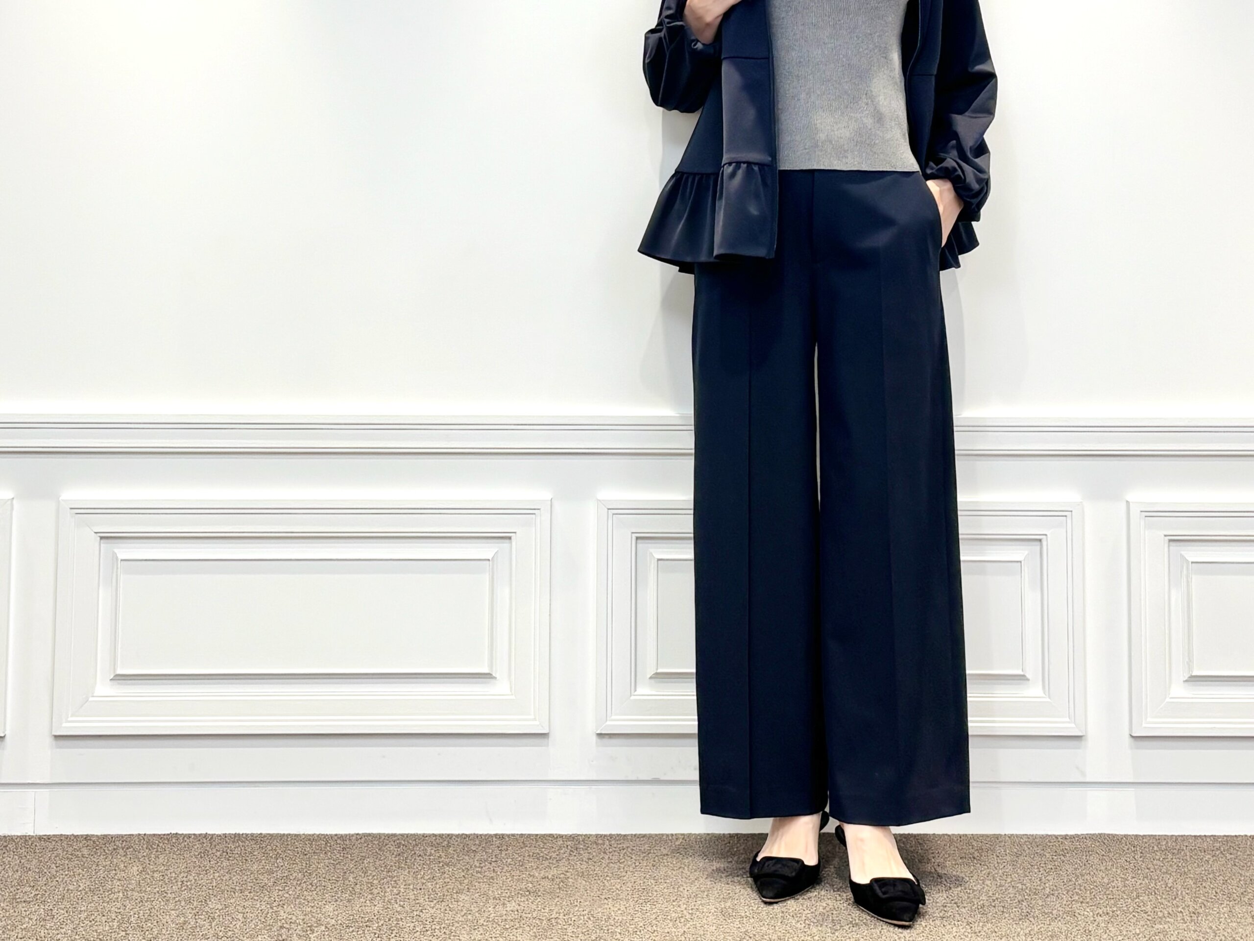 ボトムにあわせた<ストレッチセンタープレスワイドパンツ>は、センタープレスが縦のラインを美しく強調し、脚をすらりと見せてくれるアイテム。