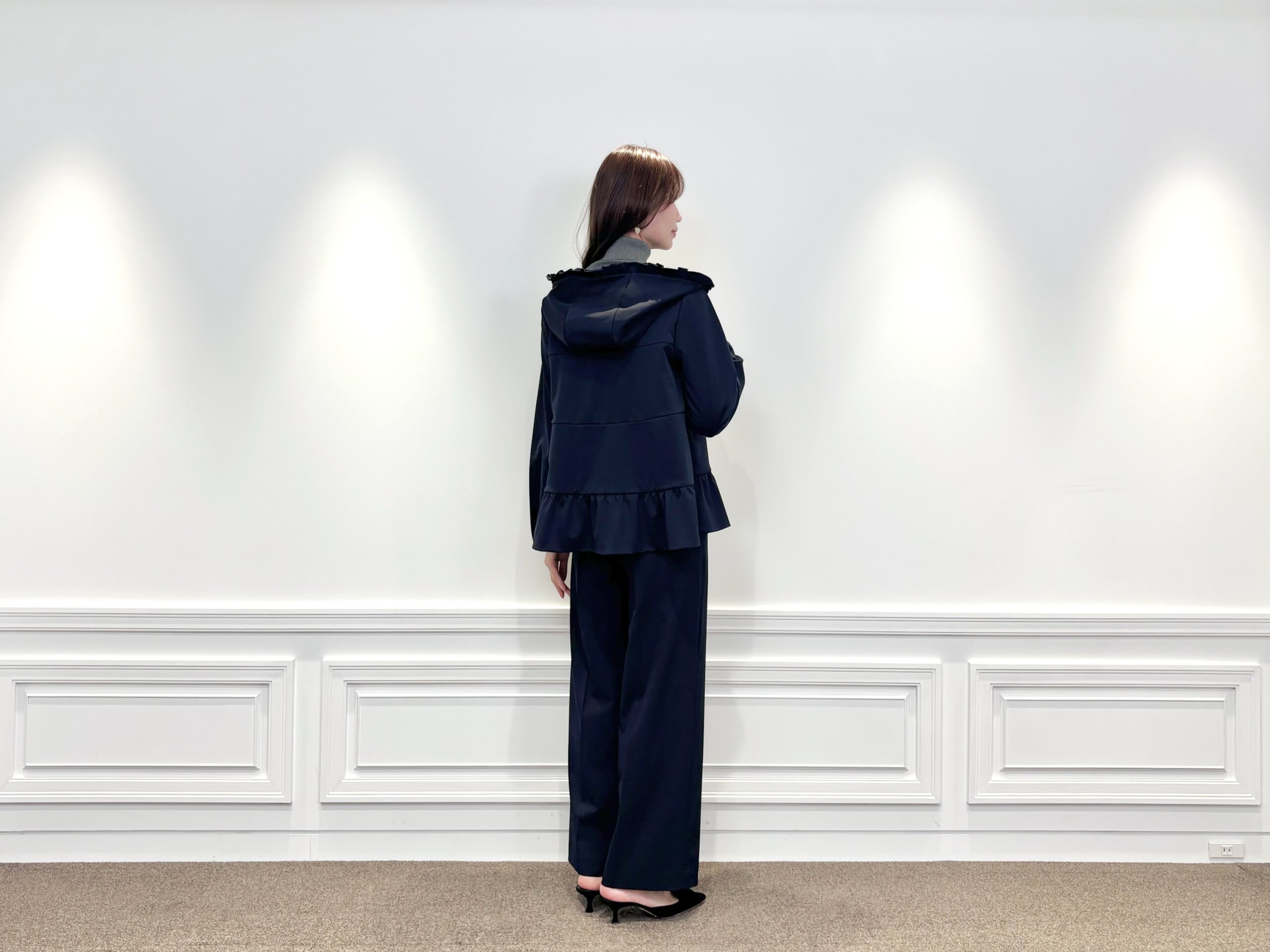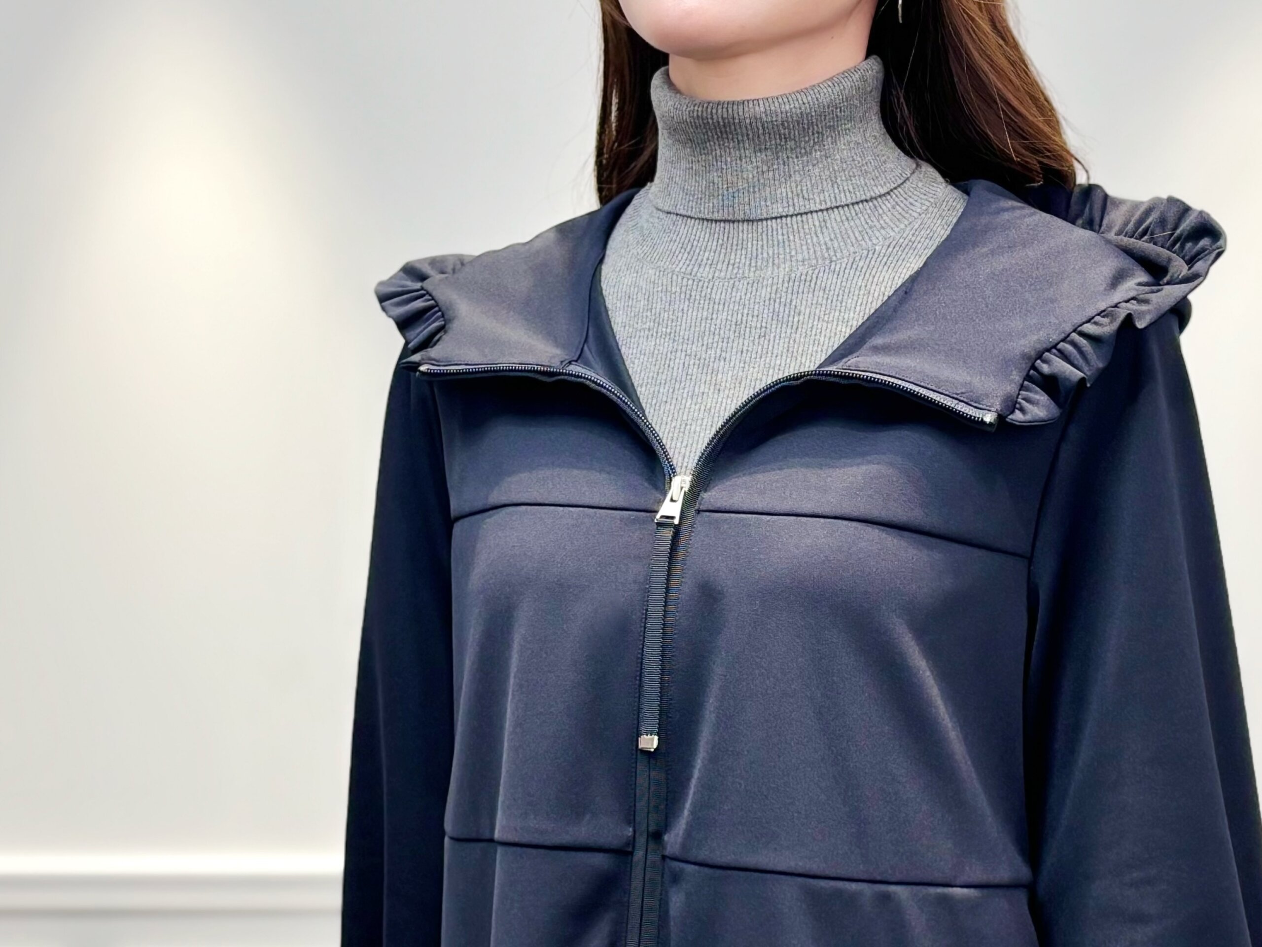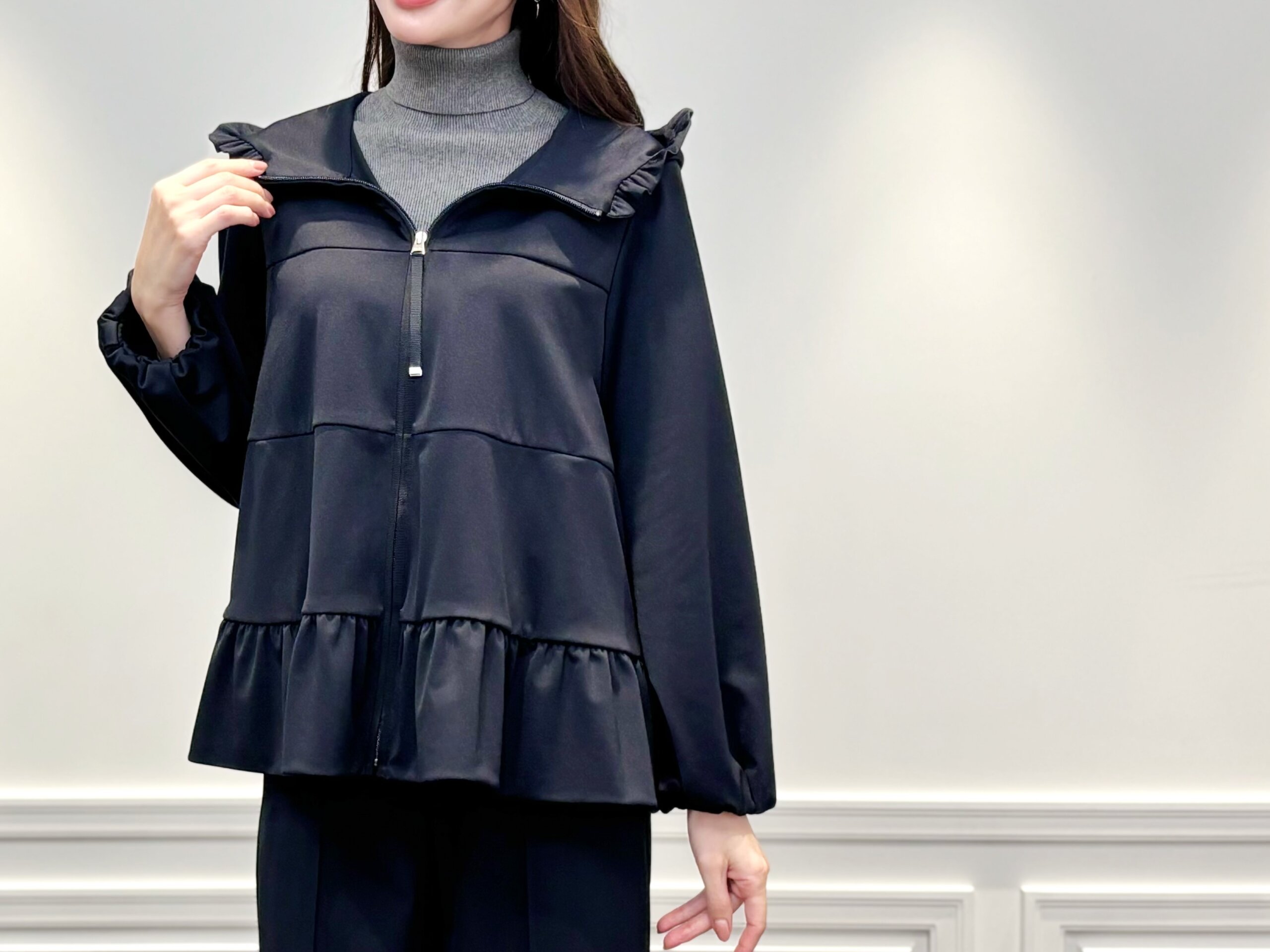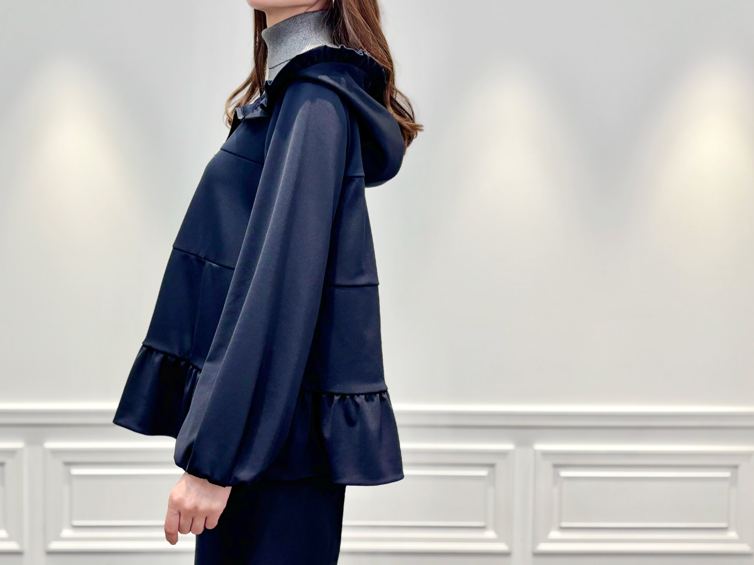 また、ジップを少し下げてフード部分を広げる事で、フリルのついたビッグカラーのような着こなしに。抜け感がありフェミニンに華やぐ個人的お勧めの着こなしです♩