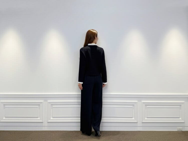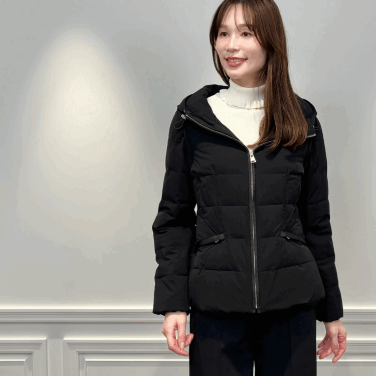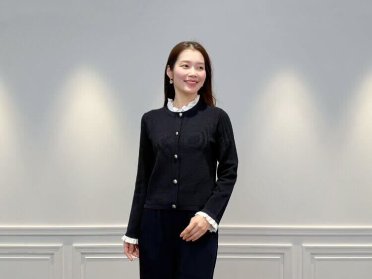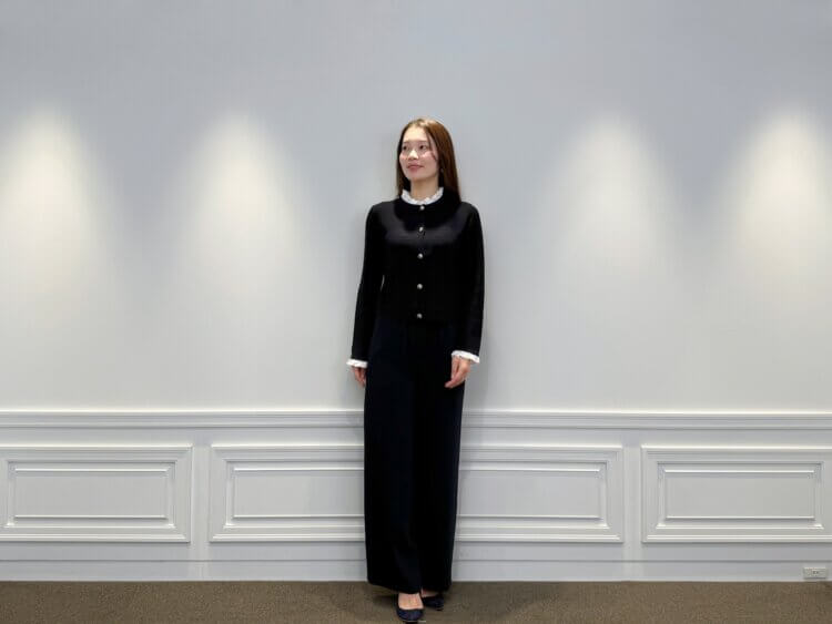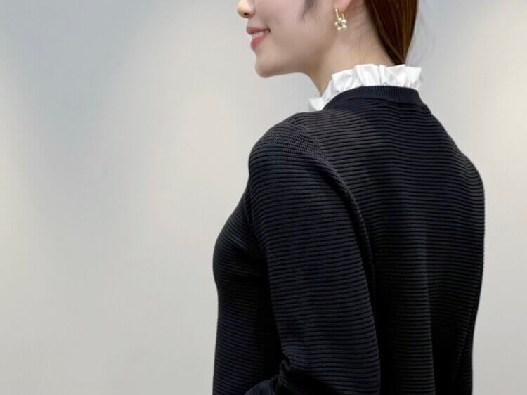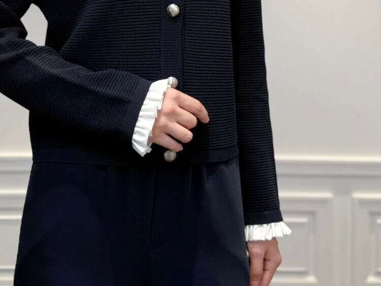 深みのあるネイビーを軸にすることで、落ち着きと信頼感のある佇まいを演出。フリルや立体感あるピンタック織の生地といった繊細なディテールが、シンプルな配色の中に女性らしい表情を添えます。