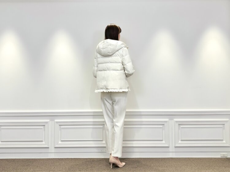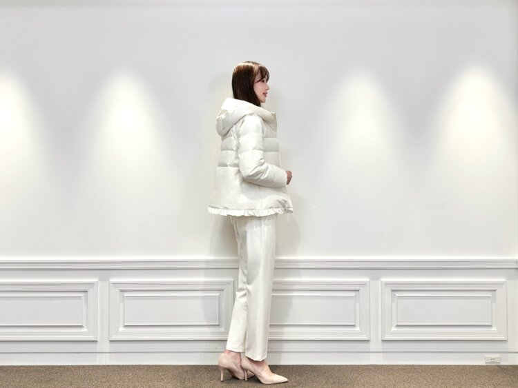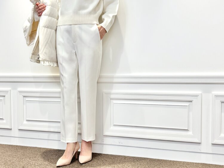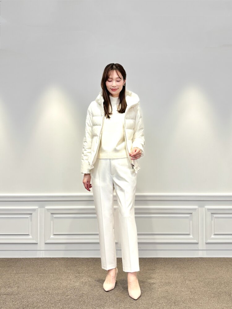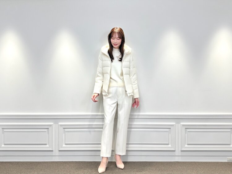 ふわりと軽やかなホワイトダウンに、同系色のニットとテーパードパンツを合わせた抜け感のあるワントーンスタイル。