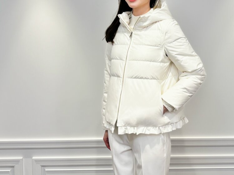 カジュアルになりすぎずエレガントな印象を叶えてくれる<ヘムフリル2WAYダウンコート>。