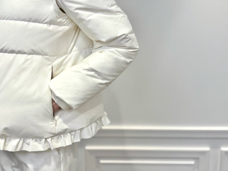 マットなニット、繊細なツヤ感のパンツ、ダウンのふくらみ…それぞれの素材が立体感を生み、のっぺりしがちな白コーデに奥行きをプラスします。