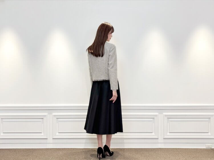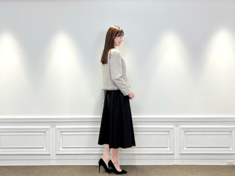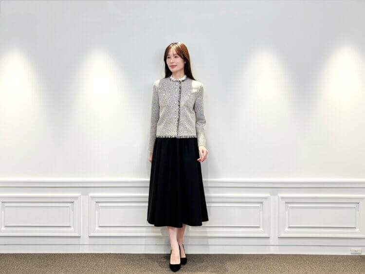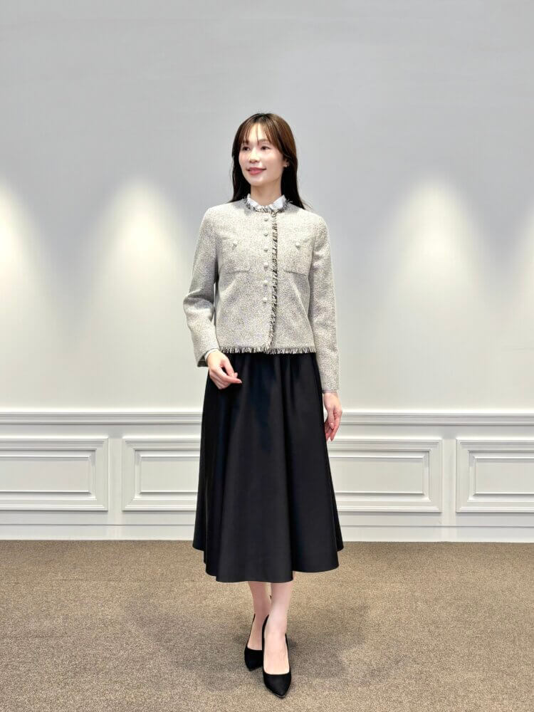 ボトムには、落ち感の美しいブラックのフレアスカートを合わせることで、動くたびにエレガントな印象に。甘さを程よく抑えたモノトーン配色は、式典や学校行事、少し改まったお食事の席にも安心してお召しいただけます。