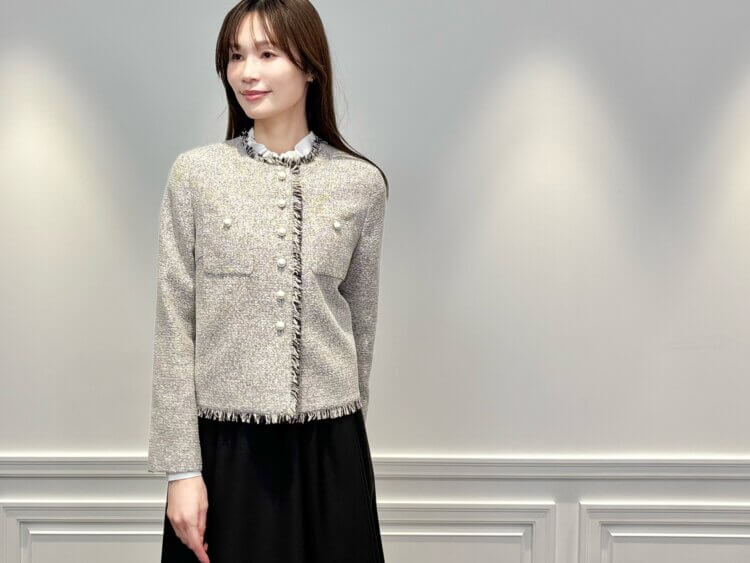 ノーカラーデザインですっきりとした印象を与えながら、繊細なフリンジと上品に煌めくパールボタンが女性らしい華やかさを演出します。程よくコンパクトな丈感でスカート、パンツどちらにもバランスよくお召いただけます。