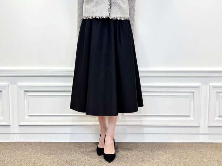 動くたびに広がるフレアシルエットが美しく、長めの丈感が上品なスカートです。