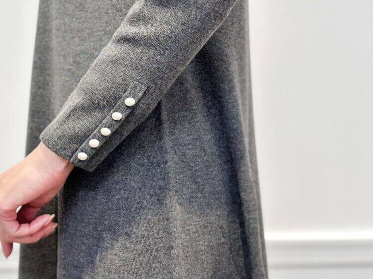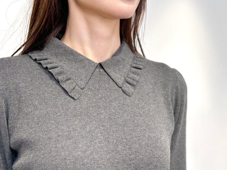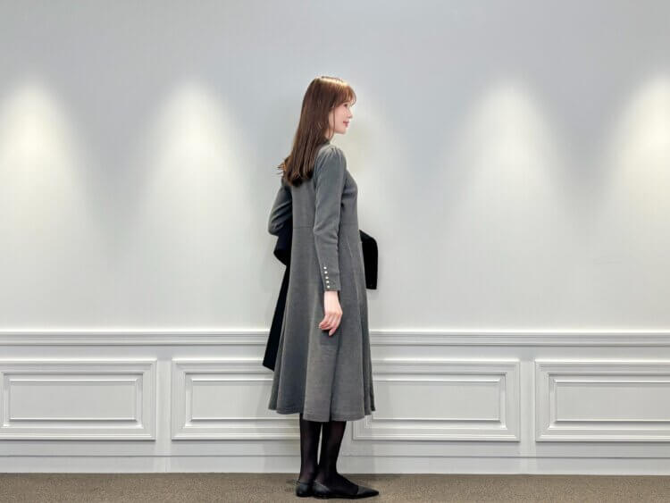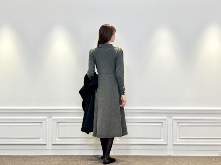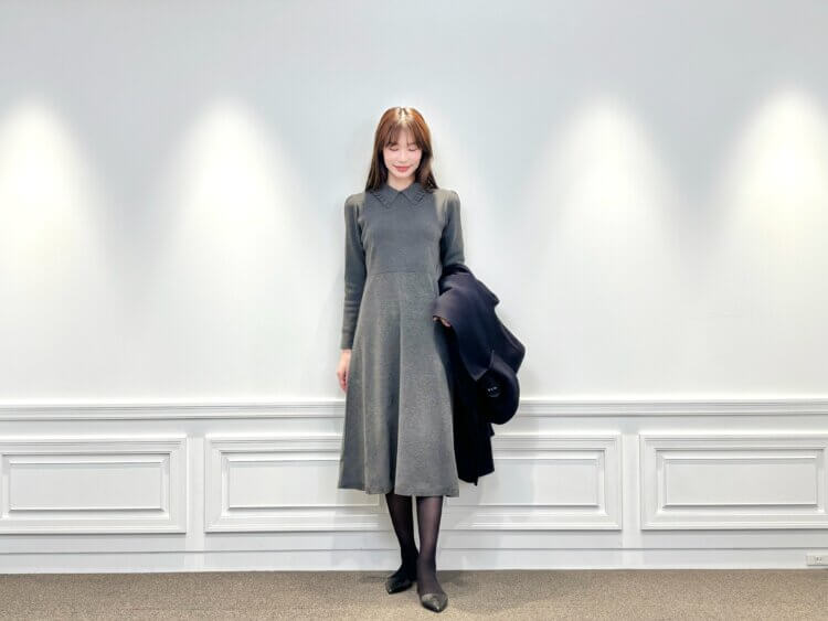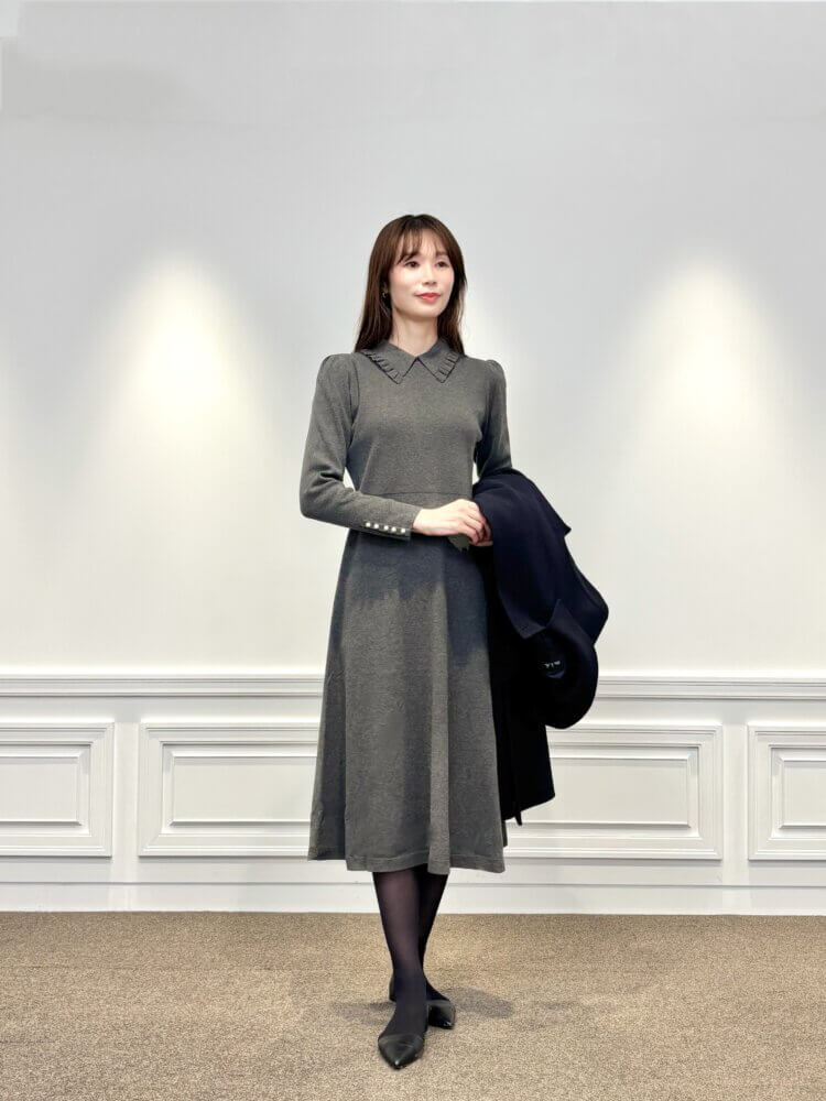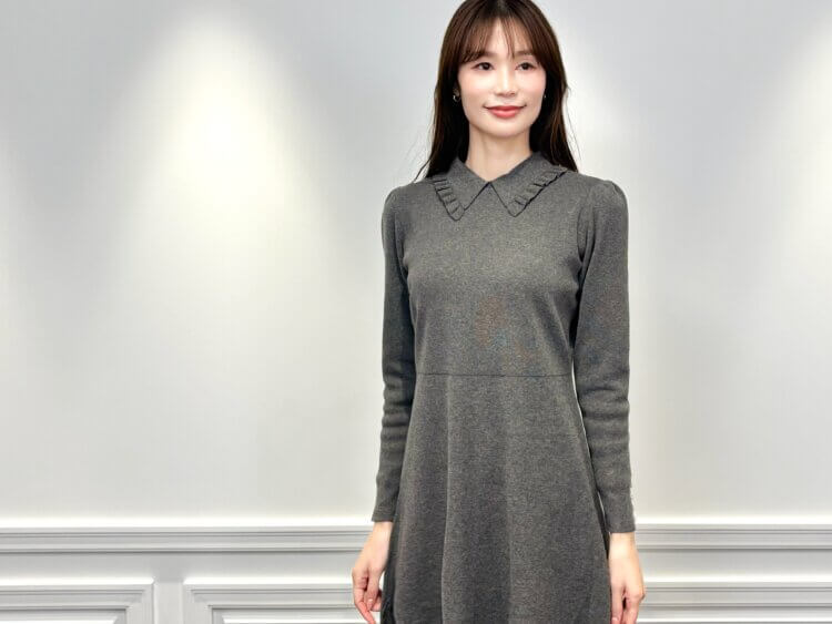 フリルをあしらった襟元がさりげない華やぎを添える、グレーのニットワンピースを主役にしたコーディネート。やわらかなニット素材ならではの落ち感が、体のラインを拾いすぎず、自然に美しいシルエットを演出してくれます。