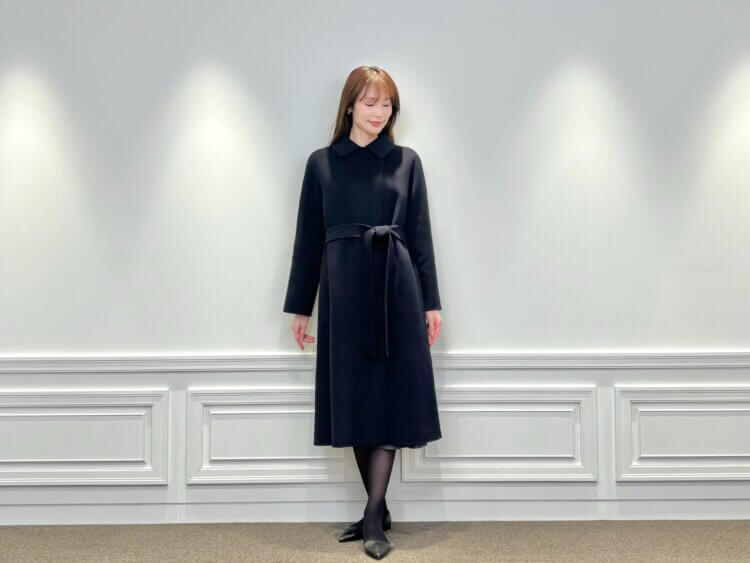アウターにはネイビーの<Super120’sベルテッドロングコート>を合わせて、全体を引き締めつつ知的なムードに。グレー×ネイビーの落ち着いた配色が、大人ならではの品格を感じさせる着こなしに仕上げてくれます。