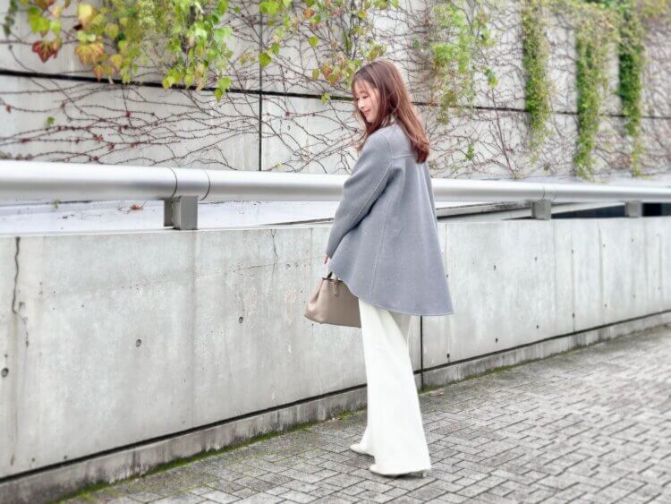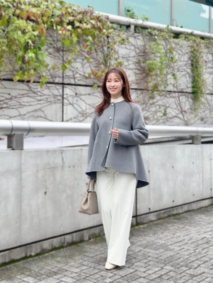 全体をグレー×ホワイトの柔らかなトーンでまとめることで、清潔感がありながらも女性らしい優しさを感じる仕上がりに。ベージュのバッグを添えると、ぐっと洗練された雰囲気になります。