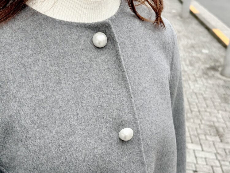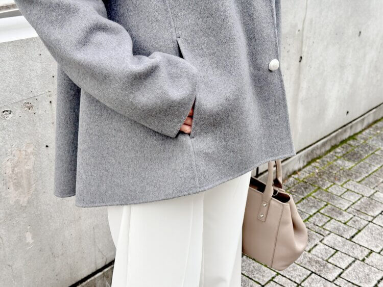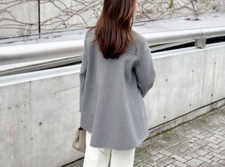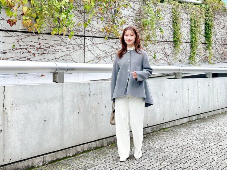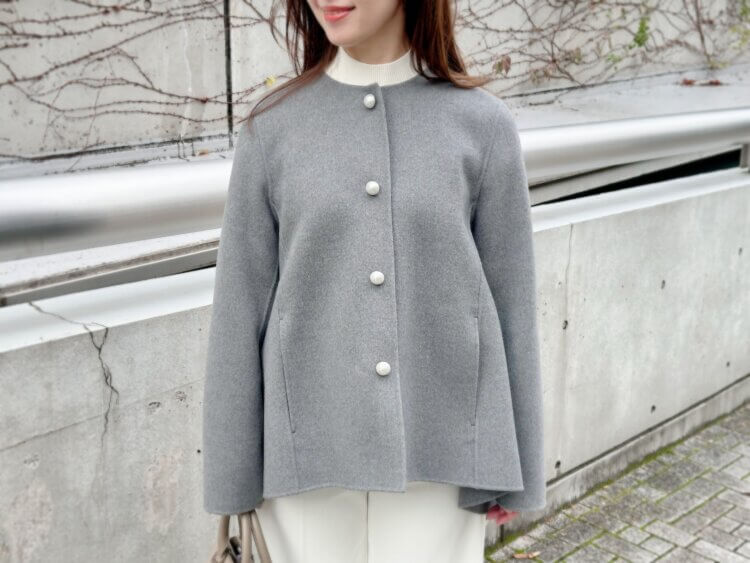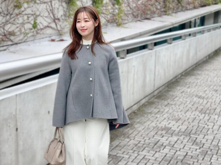 コートは、ふんわりとしたシルエットが印象的なラムウールリバーフレアショートコート。軽さと暖かさを兼ね備えたラムウール素材で、肩まわりもラクなのにきちんと見えします。