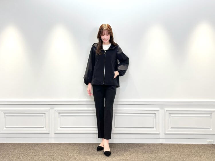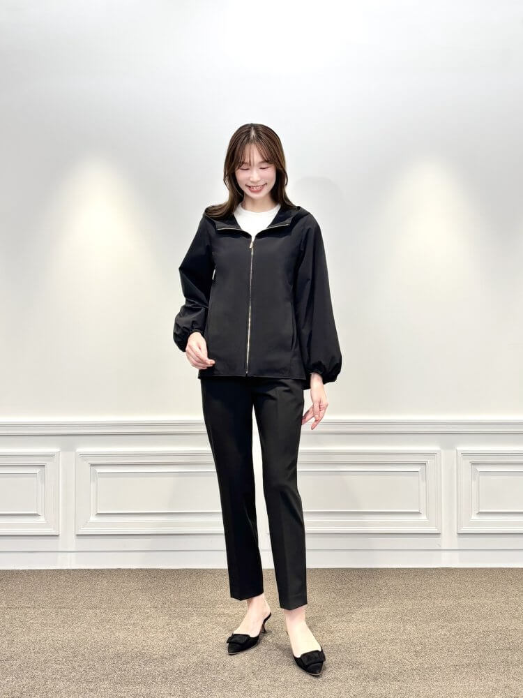 白のニットプルオーバーに、すっきりとしたシルエットのテーパードパンツを合わせ、軽やかな着心地のジップアップナイロンパーカーを羽織った上品なパンツスタイル。朝晩の気温差にも対応できる今の季節にぴったりのコーディネートです。