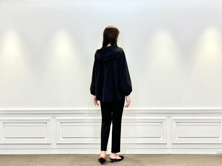 バックギャザーのデザインが特徴で、カジュアルすぎず女性らしさを引き立ててくれるのがポイント。