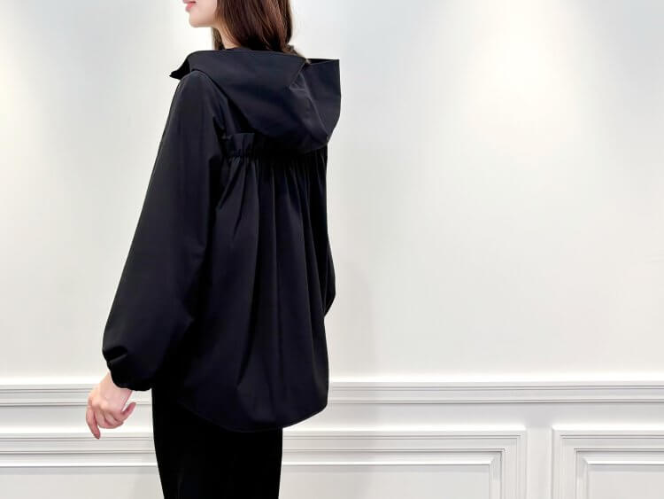 カジュアルに見えがちなナイロンパーカーですが、バックスタイルにたっぷりと寄せたギャザーデザインとふんわりとしたボリュームあるスリーブデザインが女性らしい華やかさを演出します。また、撥水加工を施したナイロン素材が急な天候の変化にも対応でき、ジップ開きでサッと羽織れる実用性も嬉しいポイントです◎
