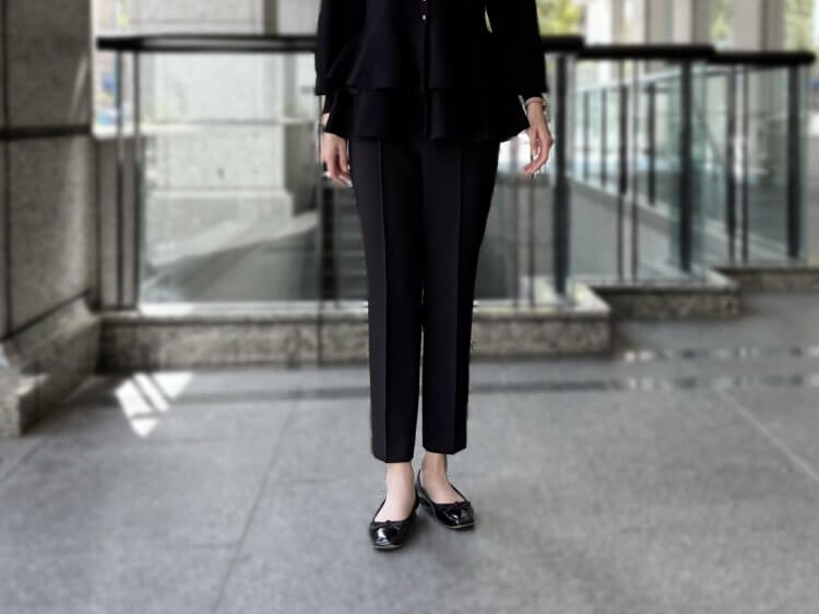 ボトムには、脚のラインを美しく魅せるピンタック入りのテーパードパンツをチョイス。